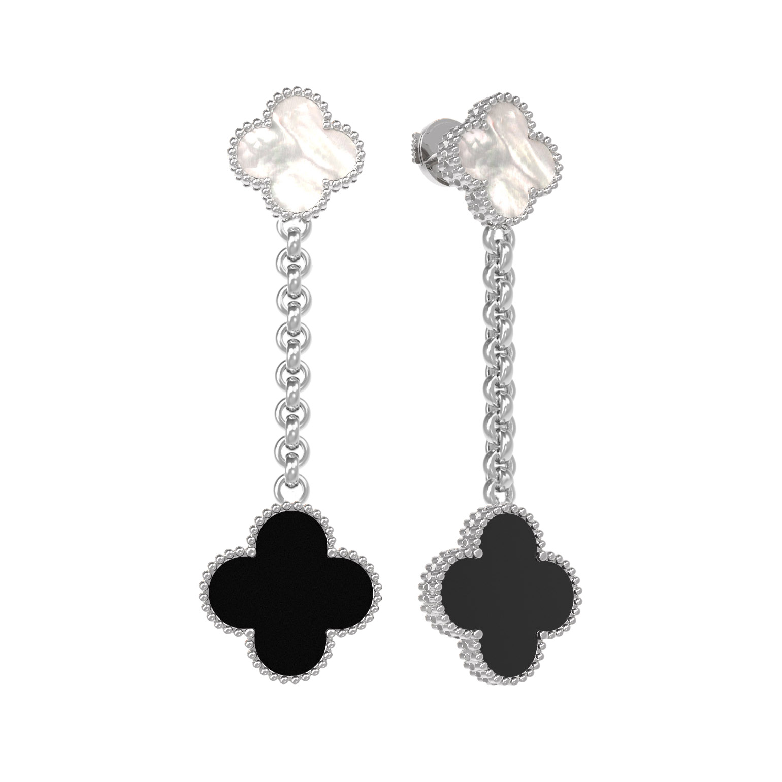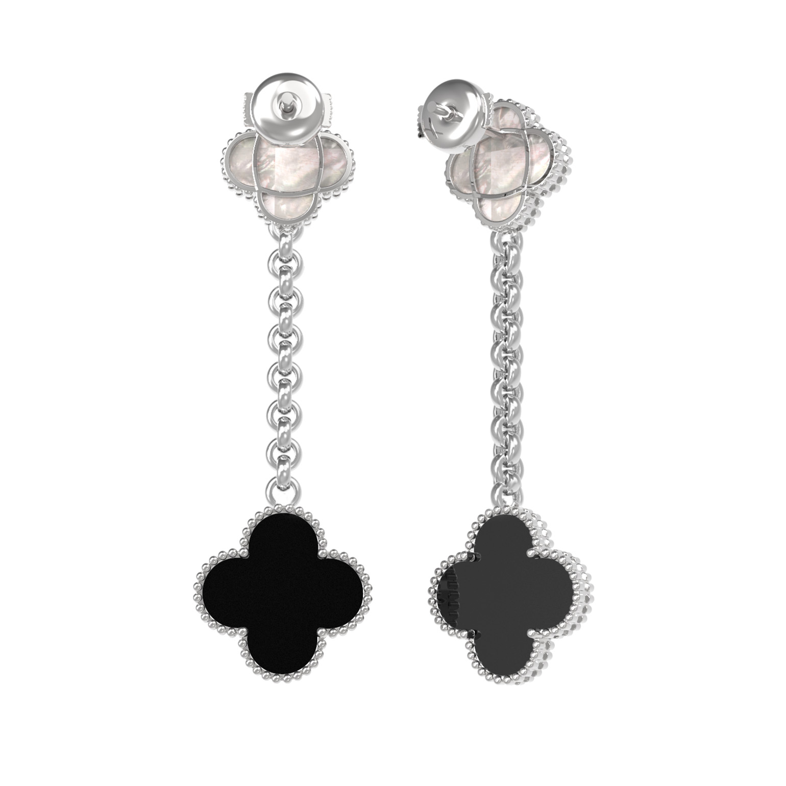 Серьги декорированы двумя вставками — загадочным ониксом черного цвета и нежным перламутром. Контрастное сочетание глубокого черного и мягкого перламутрового оттенков придает изделию особую выразительность и глубину. Лаконичная форма и классическое исполнение делают эти серьги из белого золота отличным выбором как для женщин, так и для мужчин, которые ценят лаконичный дизайн и премиальные материалы.