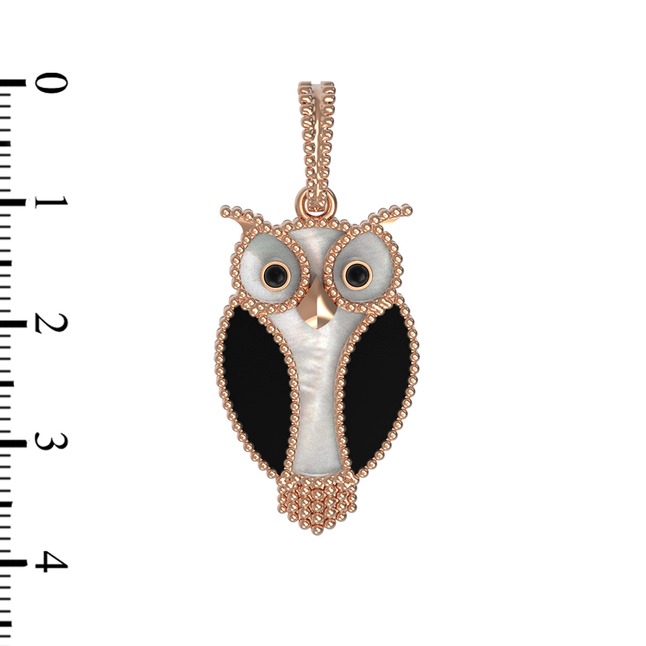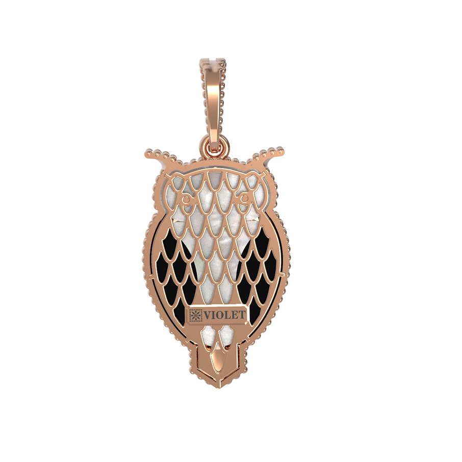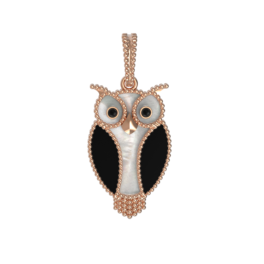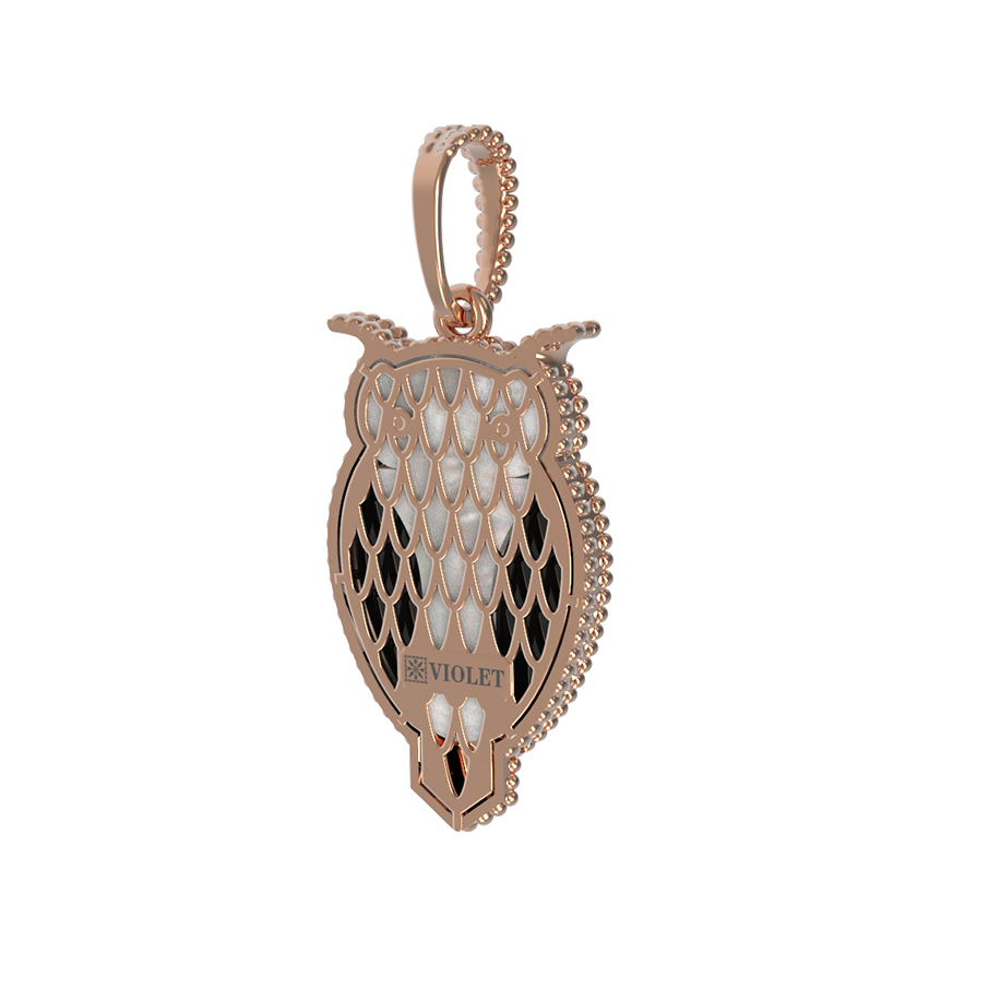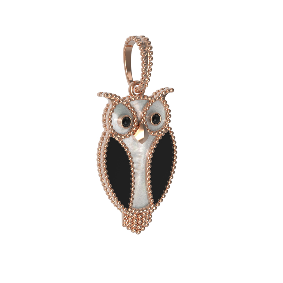 Откройте для себя магию ювелирного искусства с утонченной подвеской из коллекции De Luxe — В стране чудес. Это изделие представляет собой гармоничное сочетание классических традиций и современного дизайна, выполненное в форме мудрой совы. Украшение создано из красного золота 585 пробы, чей теплый и благородный оттенок подчеркивает детализацию каждого элемента. В дизайне использованы две вставки: глубокий черный оникс и нежный переливающийся перламутр. Контраст этих материалов создает выразительный визуальный эффект, который дополняется искусным нанесением эмали.