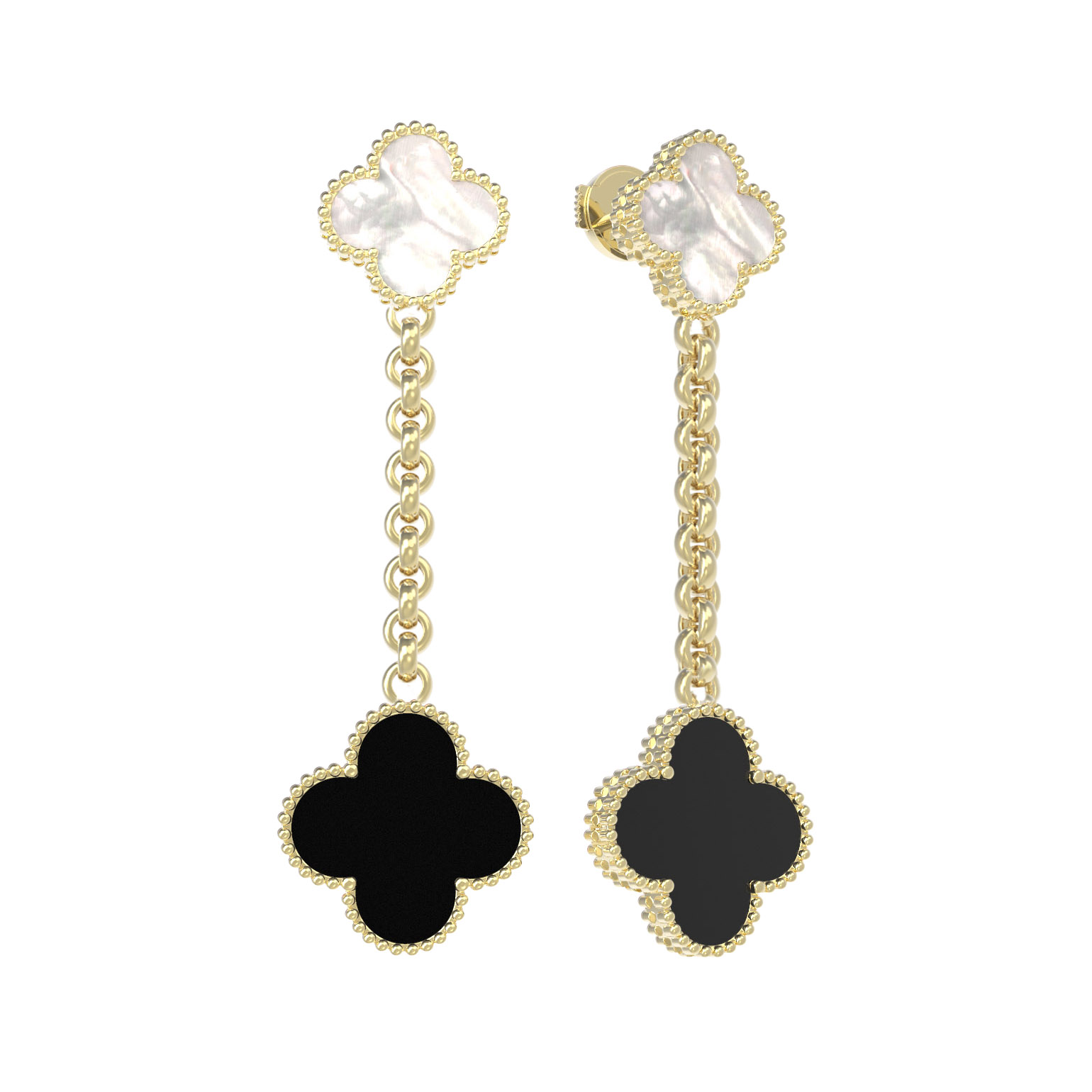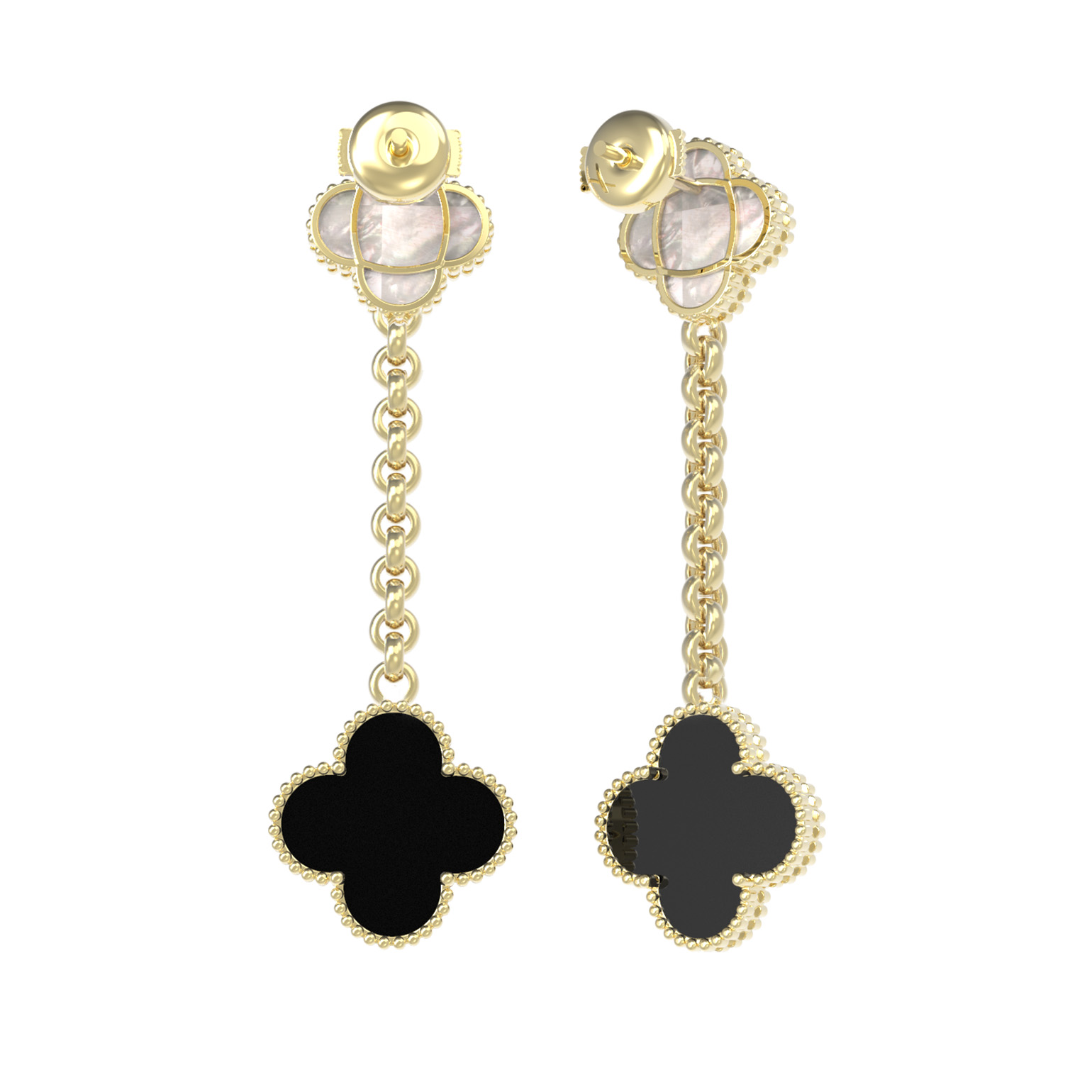В центре композиции находятся две вставки, которые создают завораживающий контраст: глубокий черный оникс и нежный перламутр. Сочетание темного и светлого цветов позволяет серьгам гармонично дополнять как деловой, так и вечерний образ. Ювелирное изделие подойдет как для женщин, так и для мужчин, предпочитающих стильные и статусные аксессуары. Высокое качество исполнения и лаконичность форм делают эти серьги универсальным дополнением к вашей шкатулке.