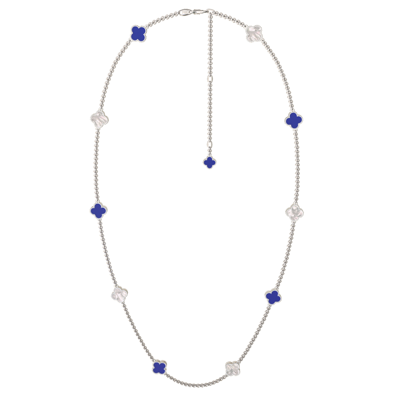 На тонкой цепочке гармонично расположились 6 вставок в форме клевера. Чередование синего лазурита и перламутра придает украшению динамичность и особую выразительность. Лаконичная форма и благородные материалы делают это колье универсальным аксессуаром, который подходит как для женщин, так и для мужчин. Украшение можно носить как самостоятельный элемент ювелирного гардероба, так и в качестве части стильного комплекта, дополняя его другими изделиями из этой серии.