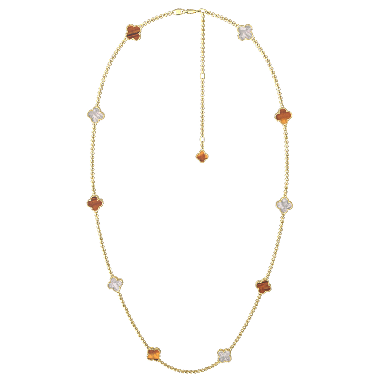 Колье из лимонного золота с тигровым глазом и перламутром станет изысканным акцентом вашего образа. Это утонченное ювелирное изделие из коллекции De Luxe — Клевер выполнено в популярном дизайне «клевер», который символизирует гармонию и удачу. Теплый блеск лимонного золота 585 пробы идеально подчеркивает красоту шести вставок, чередующих в себе глубокий оранжевый цвет тигрового глаза и нежное сияние перламутра.