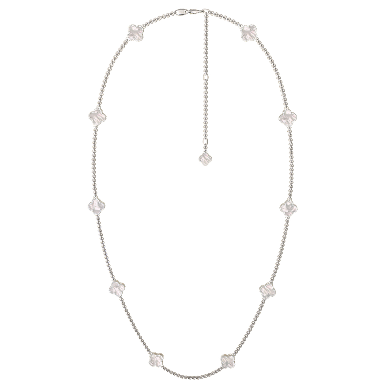 Изделие гармонично впишется в ваш ювелирный гардероб и отлично сочетается с другими украшениями. Вы можете дополнить колье другими аксессуарами, создавая стильные комплекты, которые подчеркнут ваш безупречный вкус. Ювелирное изделие из белого золота с перламутровыми вставками — это выбор в пользу долговечной красоты и элегантности, которые никогда не выходят из моды.