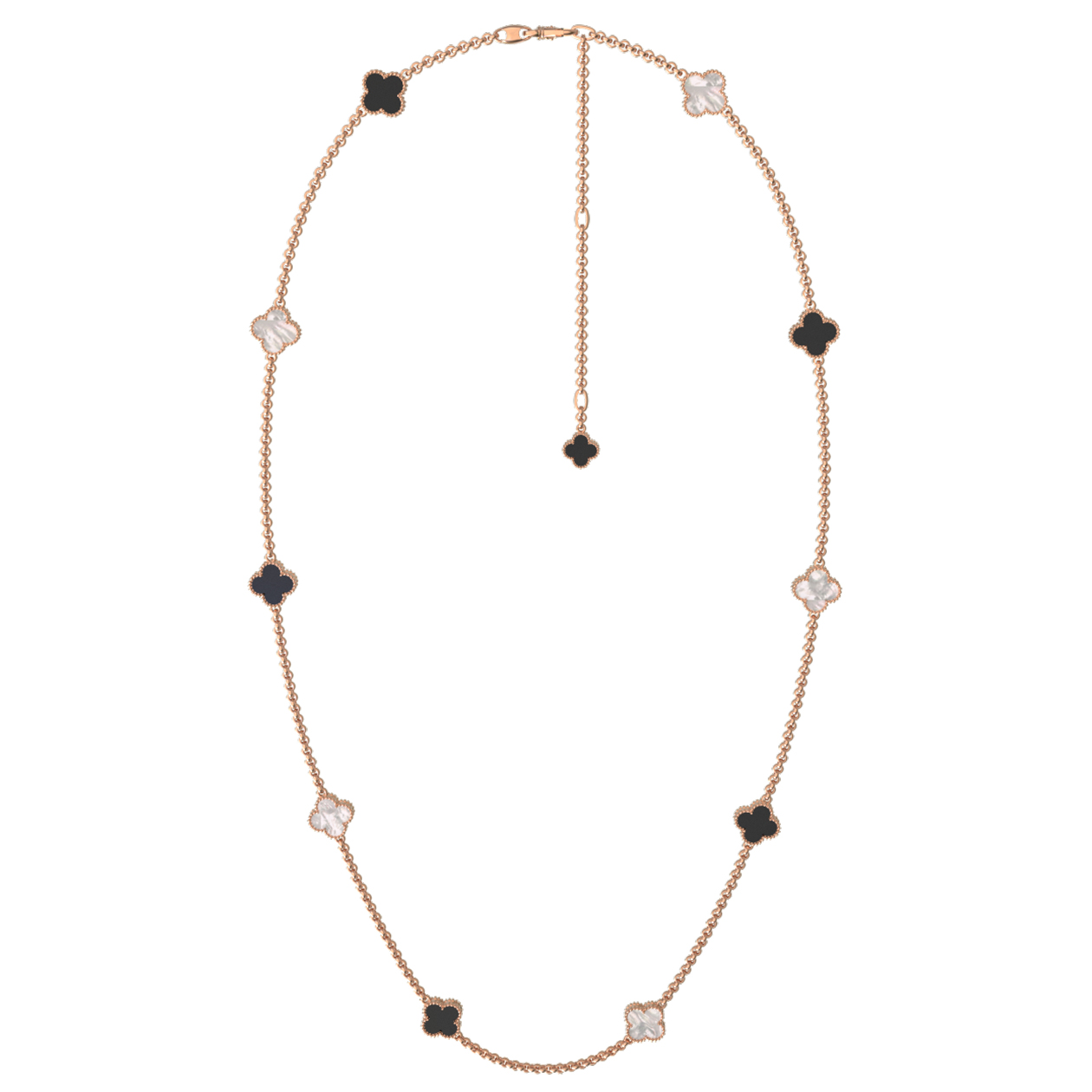 Роскошное сочетание драгоценного металла теплого оттенка и контрастных вставок делает это колье по-настоящему уникальным. В композицию гармонично вписаны 6 вставок: глубокий черный оникс и нежный перламутр чередуются, создавая притягательную игру света и цвета. Универсальность модели позволяет носить ее как женщинам, так и мужчинам, ведь лаконичная эстетика клевера остается актуальной вне гендерных рамок. Такое украшение идеально подходит как для повседневного ношения, так и для торжественных случаев.