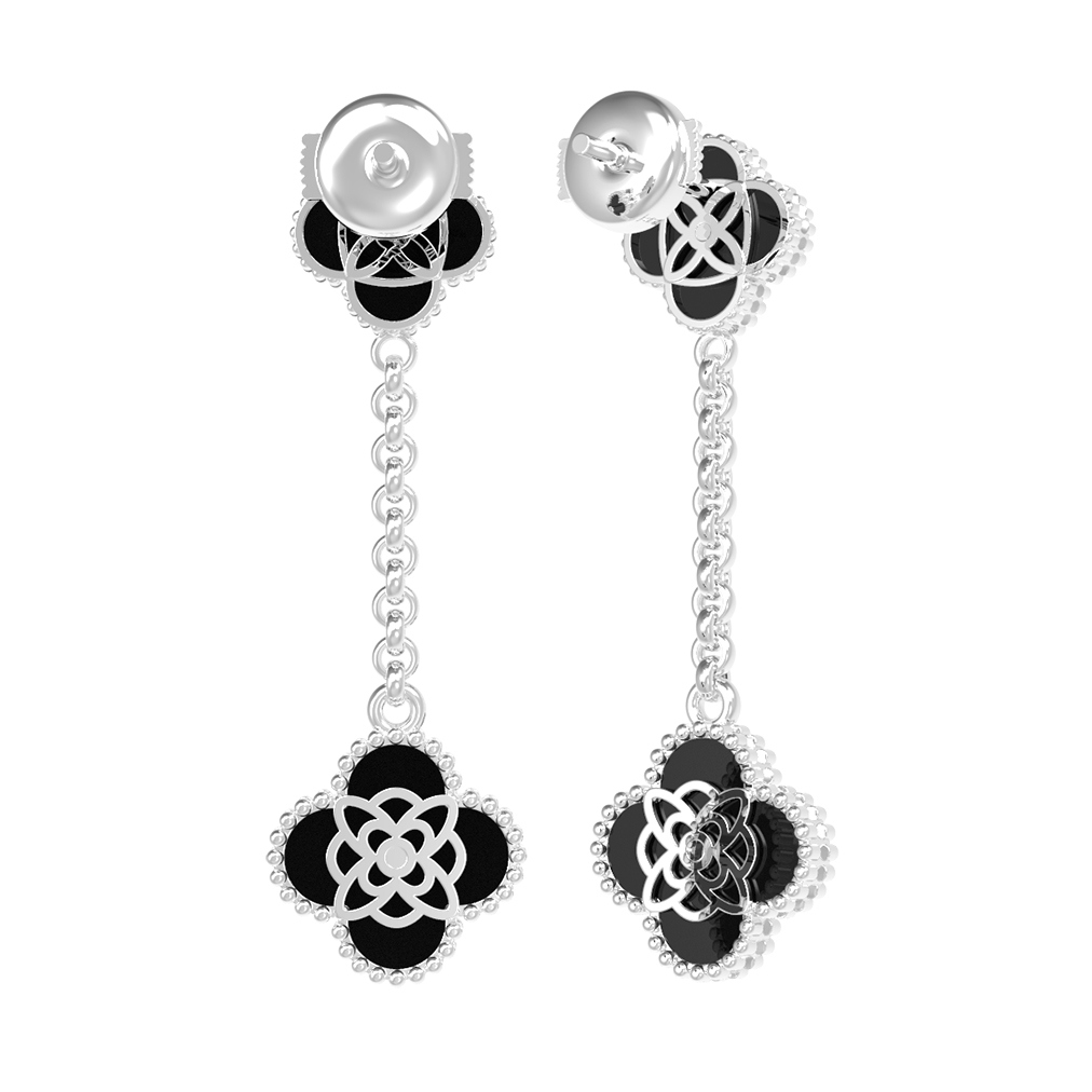В центре каждого элемента гармонично расположились восемь вставок круглой формы — это сверкающие бриллианты, которые добавляют изделию премиального сияния. Белые и черные вставки эффектно подчеркивают чистоту линий и мастерство ювелиров. Удлиненная конструкция серег с подвижным соединением придает образу динамику и грацию.