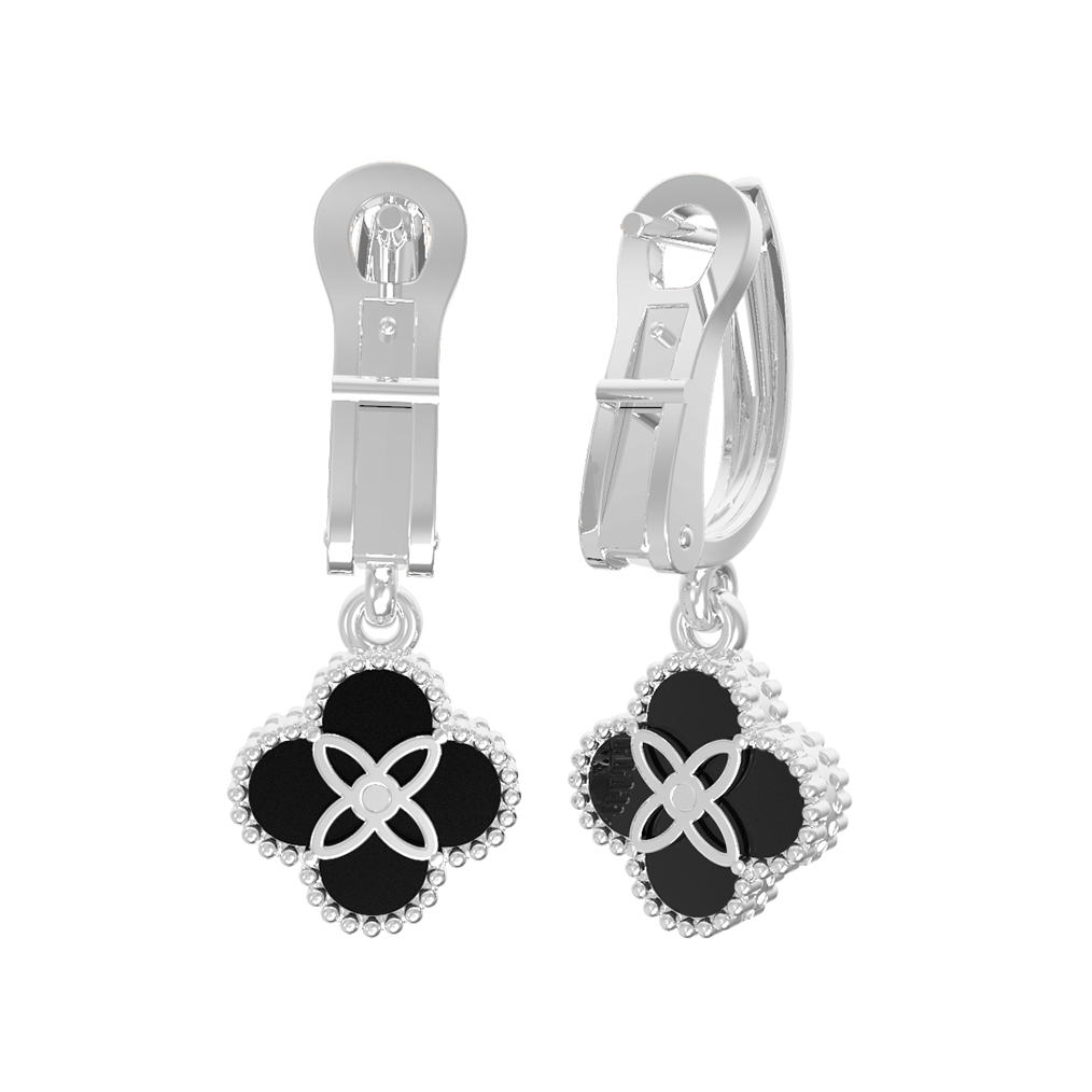 Элегантные серьги из белого золота 585 пробы — это воплощение стиля и утонченного вкуса, созданное в рамках коллекции De Luxe — Клевер. Ювелирное изделие выполнено в изысканном дизайне «клевер», который стал символом удачи и гармонии в современном ювелирном искусстве. Благородный блеск белого металла эффектно подчеркивает контраст вставок: глубокий черный оникс гармонично сочетается с сиянием четырех круглых бриллиантов, создавая выразительную композицию.