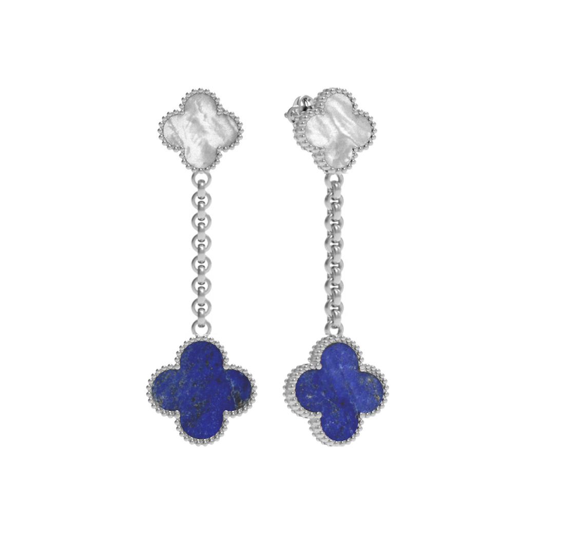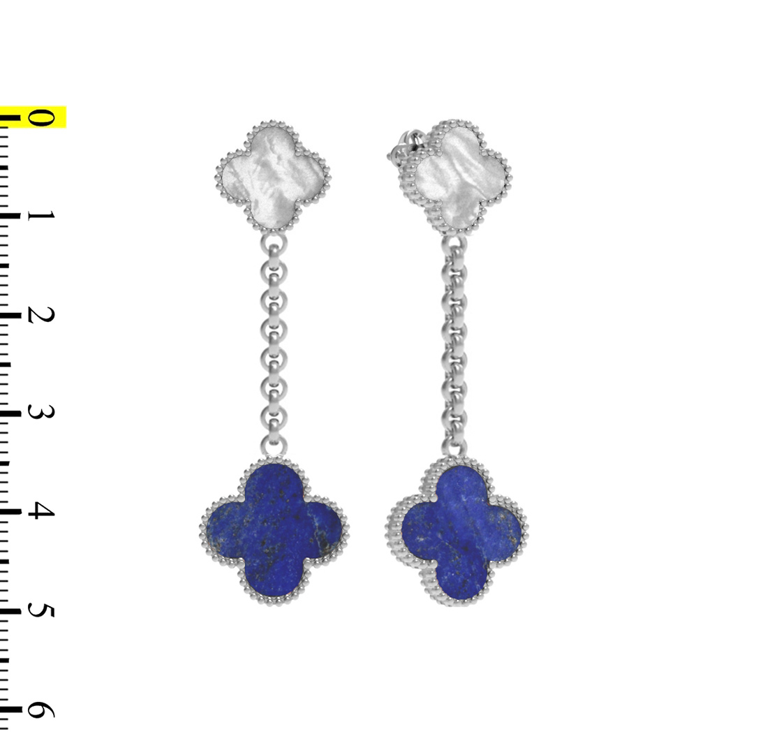 Конструкция изделия отличается утонченностью: подвесные элементы на цепочках делают украшение динамичным и живым. Белое золото идеально подчеркивает красоту натуральных камней, придавая серьгам холодный, сияющий блеск. Всего в изделии использованы две вставки, которые гармонично дополняют друг друга. Дизайн клевер стал визитной карточкой серии, подчеркивая статус и безупречный вкус владелицы или владельца.