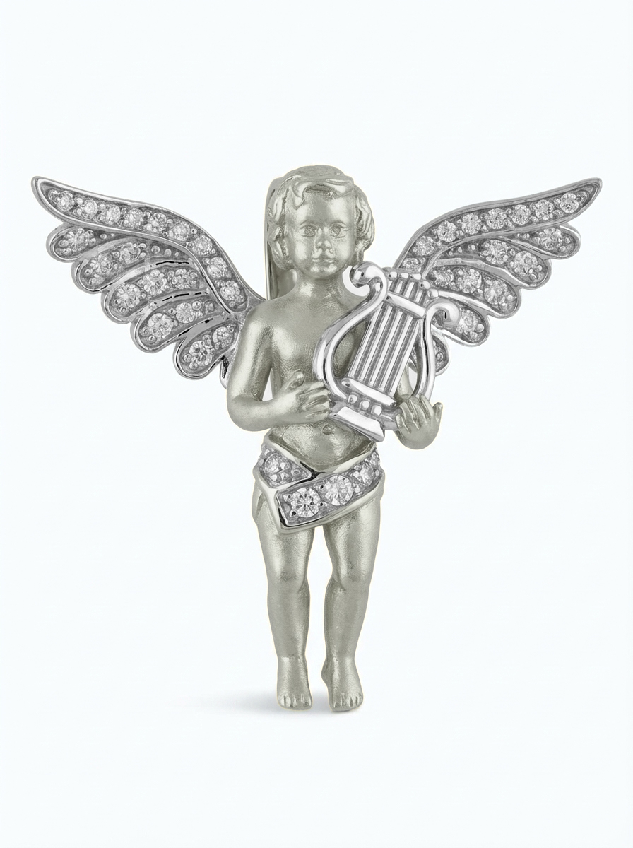 Особую выразительность подвеске придают 45 сверкающих вставок из фианита. Белые камни круглой формы расположены на крыльях ангела и его набедренной повязке, создавая эффектное сияние при каждом движении. Точечная инкрустация добавляет украшению глубину и делает его визуально более объемным и живым. Такое ювелирное решение позволяет аксессуару притягивать взгляды и служить акцентным дополнением образа.