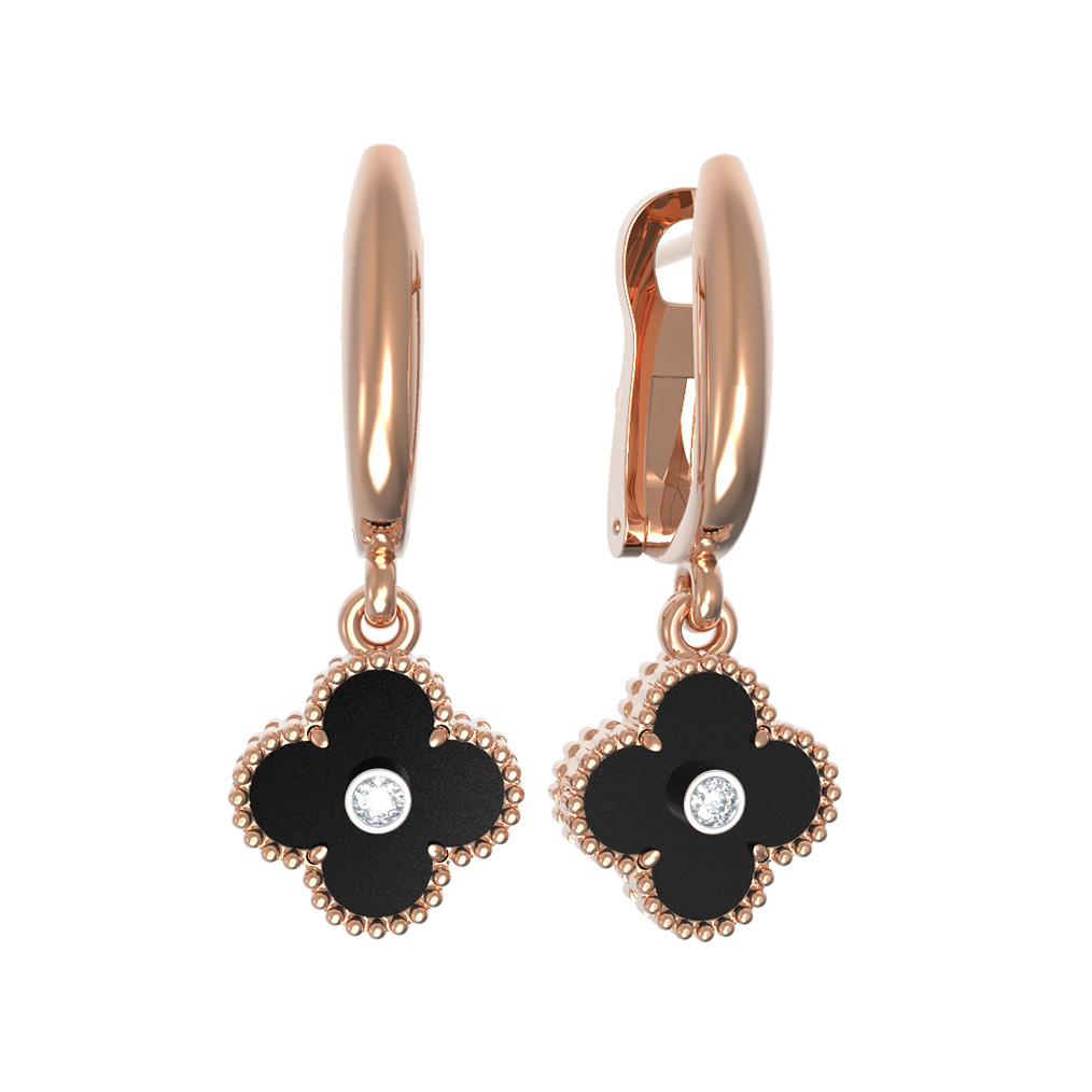 Центральным элементом композиции выступает выразительный оникс черного цвета, который великолепно контрастирует с теплым блеском красного золота. В центре каждой вставки расположен сверкающий бриллиант круглой формы, добавляющий украшению роскошного сияния. Всего в изделии использовано 4 вставки, объединяющие в себе глубину черного оникса и чистоту белого бриллианта.