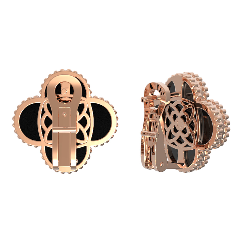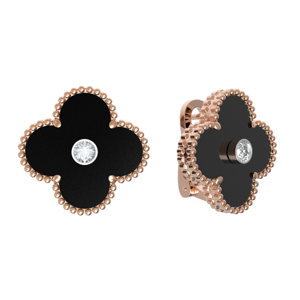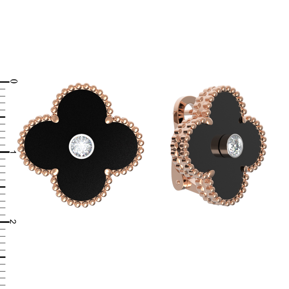 Серьги изготовлены из красного золота 585 пробы, которое отличается насыщенным оттенком и долговечностью. В центре каждого элемента расположен круглый бриллиант, создающий роскошное сияние. Основу композиции составляет выразительный оникс черного цвета, который гармонично контрастирует с драгоценным металлом и белым блеском камня. Общее количество вставок составляет 4, что обеспечивает ювелирную сбалансированность дизайна.