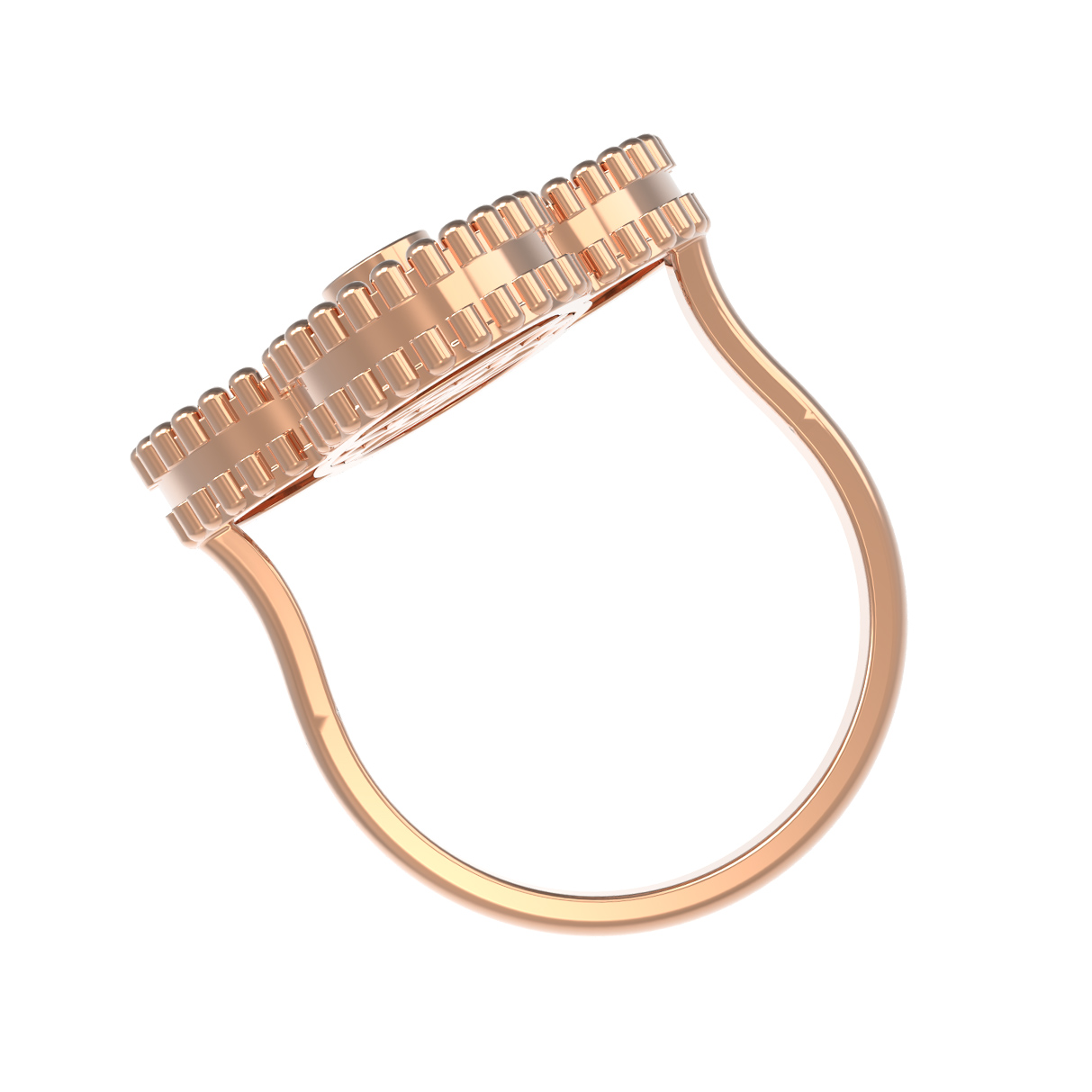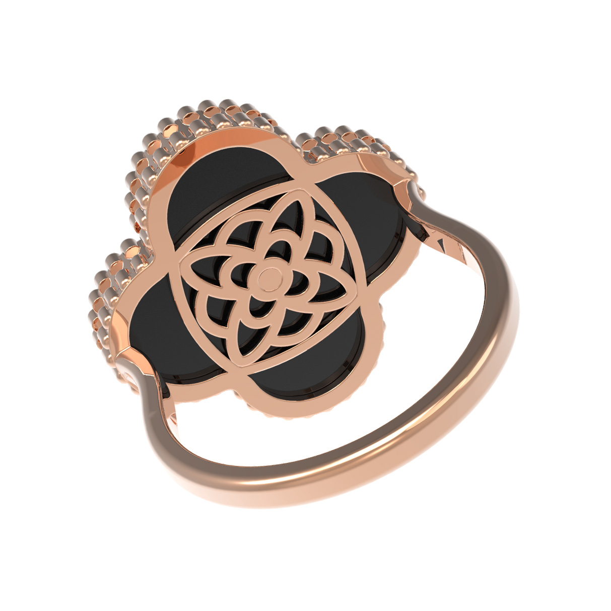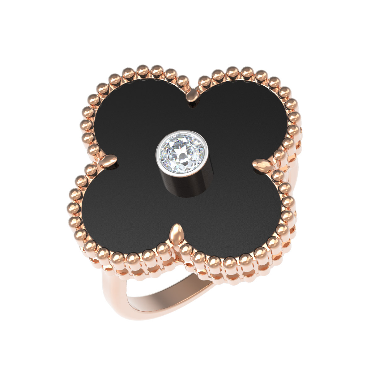 Кольцо из коллекции De Luxe — Клевер воплощает безупречный баланс классики и современной эстетики. Изделие выполнено из красного золота 585 пробы, которое придает украшению теплый, благородный оттенок. Центральным элементом дизайна стал выразительный клевер — символ удачи и гармонии, наполненный глубоким черным ониксом. Контраст черной вставки с сияющим белым бриллиантом создает утонченную игру света и цвета.