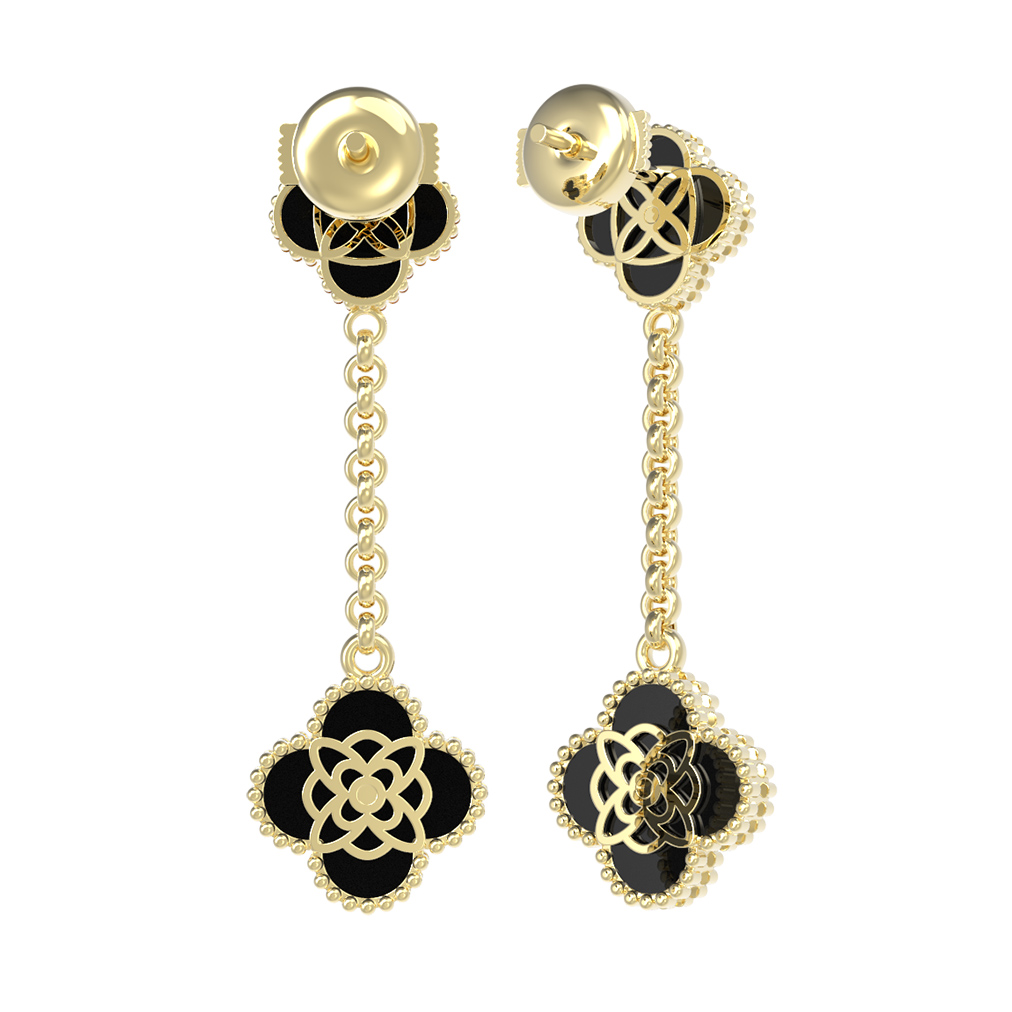 В центре каждого из восьми элементов композиции сияют бриллианты круглой огранки, которые притягивают взгляд своим неповторимым блеском. Основным акцентом выступает глубокий черный оникс, создающий выразительный контраст с лимонным золотом. Такая игра фактур и цветов делает серьги универсальным аксессуаром, который прекрасно дополнит как повседневный образ, так и роскошный вечерний наряд.