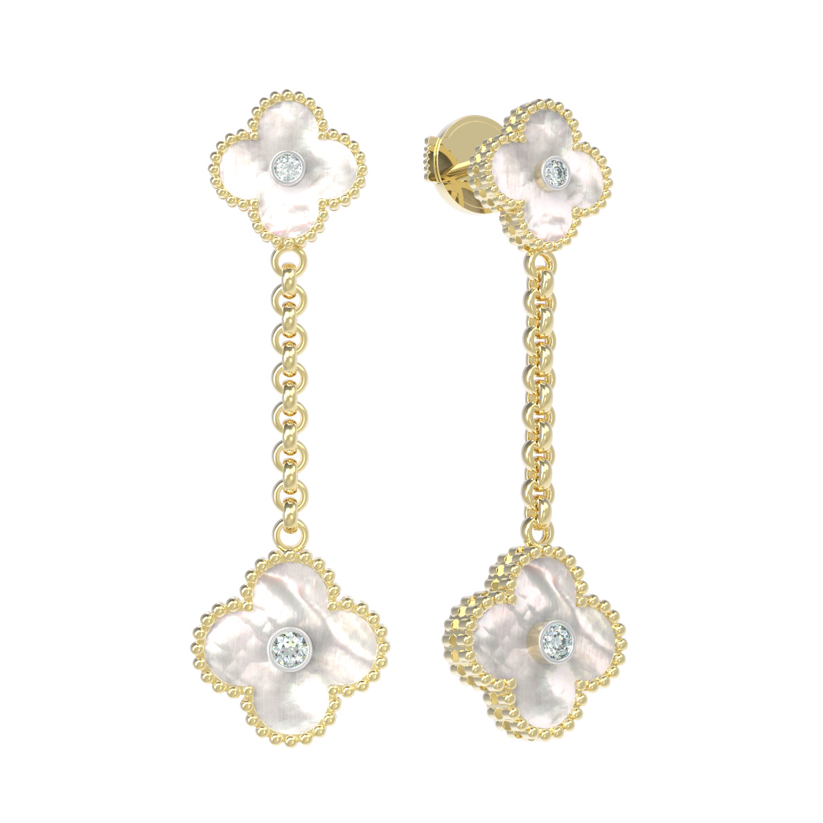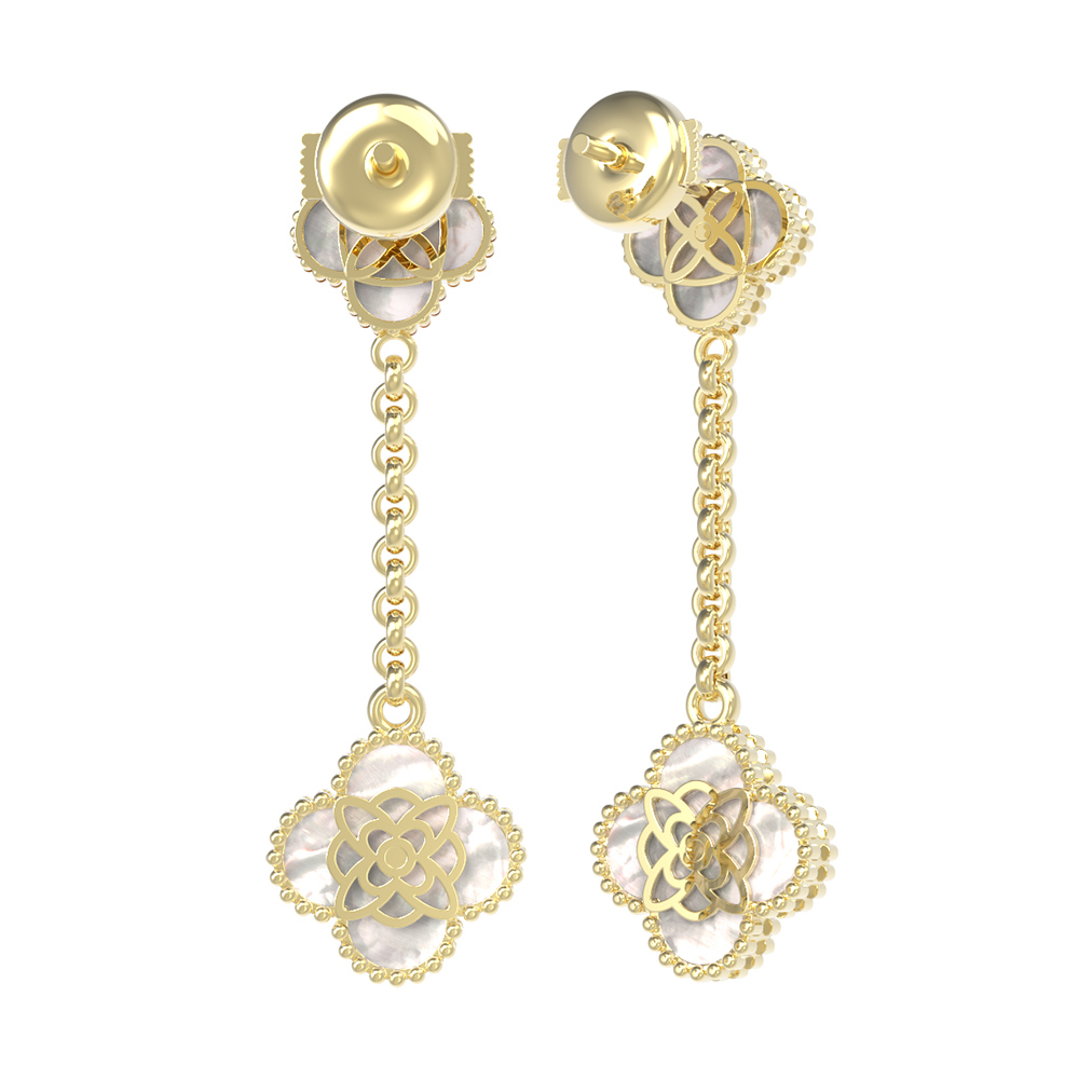 Центральным элементом композиции стали четыре вставки из благородного перламутра с характерным мягким переливом, дополненные четырьмя сверкающими бриллиантами круглой формы. Контраст нежного перламутра и классического блеска драгоценных камней создает элегантный баланс. Длинная цепочка в конструкции серег придает изделию динамику и легкость, заставляя его эффектно играть при каждом вашем движении.