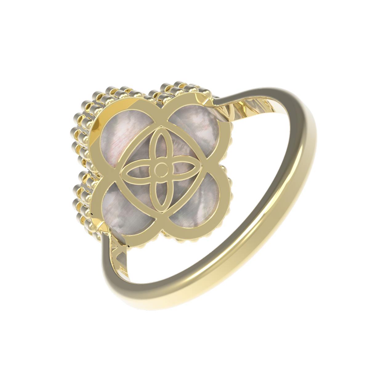 Кольцо из лимонного золота 585 пробы — утонченное украшение, которое станет акцентом вашего образа. Дизайн изделия выполнен в форме клевера, символизирующего удачу и гармонию. Основу декоративной части составляет нежный перламутр, мягкое сияние которого придает кольцу особый шарм. В самом центре композиции расположена одна вставка — бриллиант круглой огранки, который эффектно контрастирует с перламутром белого цвета и добавляет благородного блеска.