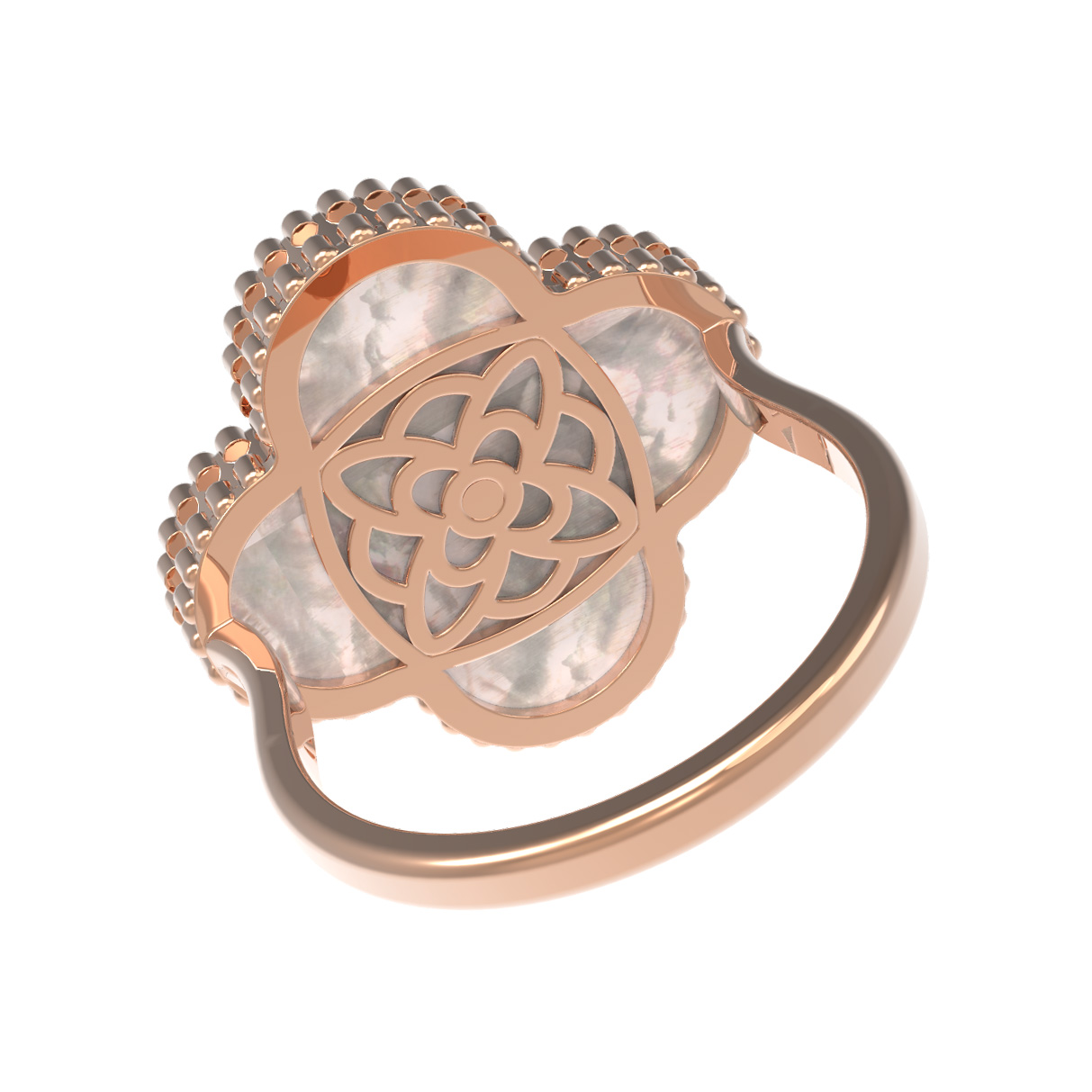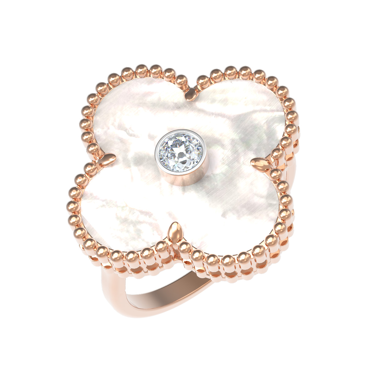 Кольцо из красного золота 585 пробы — это воплощение изящества и стиля, созданное для тех, кто ценит утонченную роскошь. Дизайн украшения, выполненный в форме клевера, подчеркивает нежность и гармонию образа. Центральным элементом декора выступает вставка из перламутра с мягким белым свечением, в самом сердце которой расположен сверкающий бриллиант круглой огранки. Сочетание теплого оттенка драгоценного металла и мерцания камня создает притягательный визуальный акцент на вашей руке.