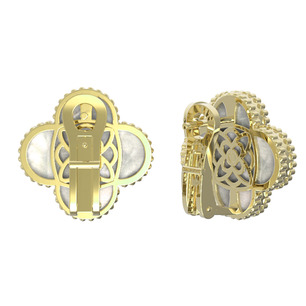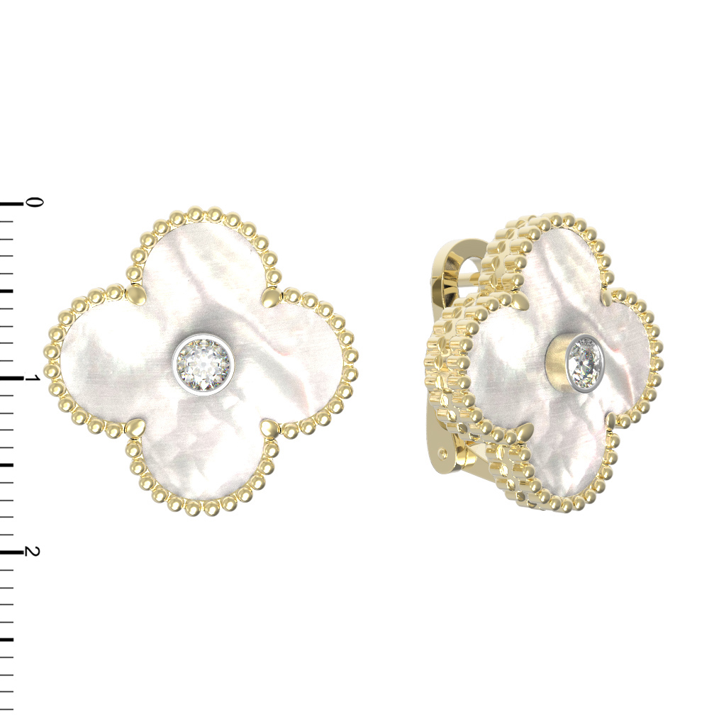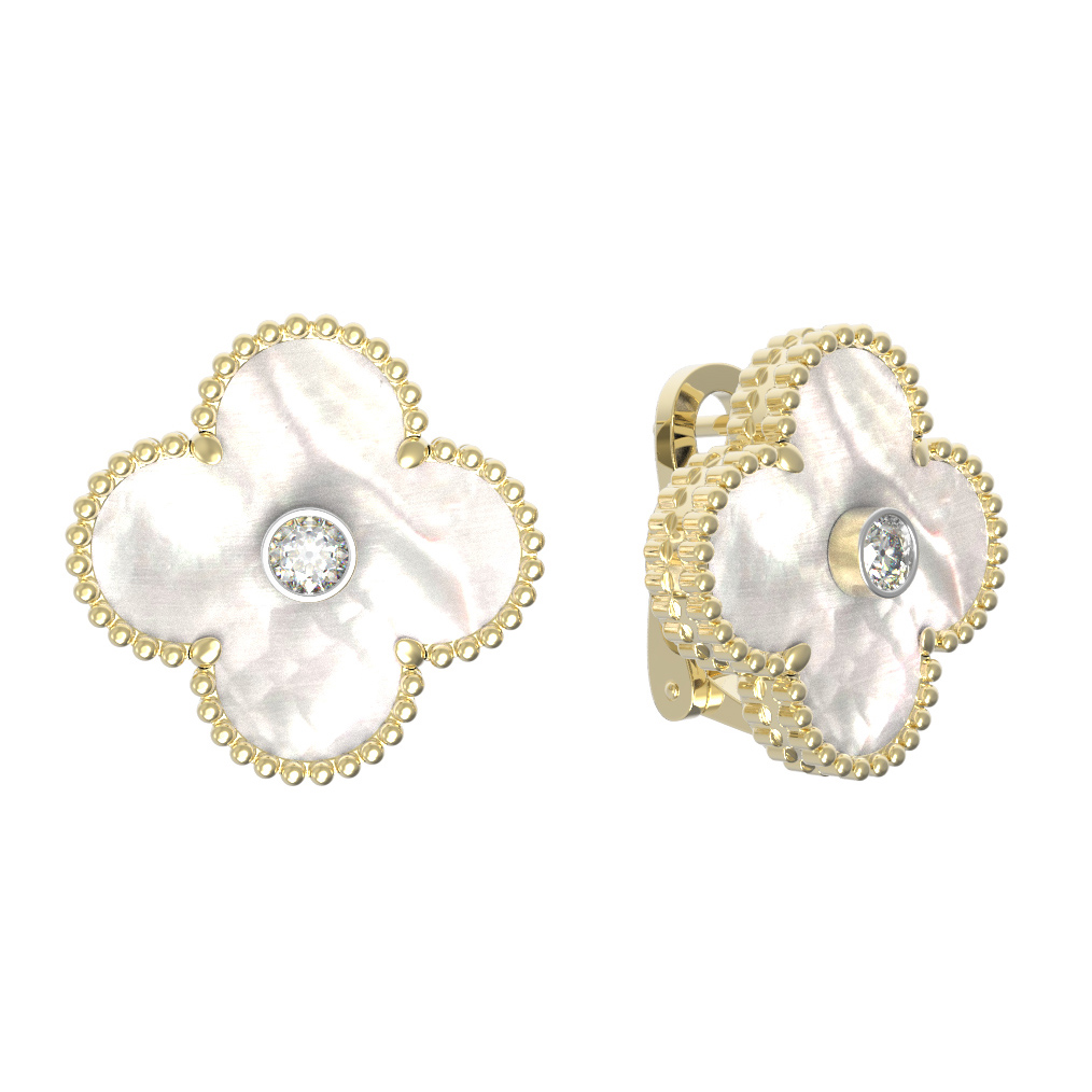 Эстетика изделий De Luxe — Клевер строится на сочетании классических форм и драгоценных материалов. Деликатный блеск перламутра гармонично дополняется холодным мерцанием двух бриллиантов, по одному в каждой серьге. Это украшение станет выразительным акцентом вашего образа, подчеркивая статус и безупречный вкус владельца. Изысканный дизайн в виде клевера считается символом удачи, что делает модель не только стильным аксессуаром, но и значимым подарком.