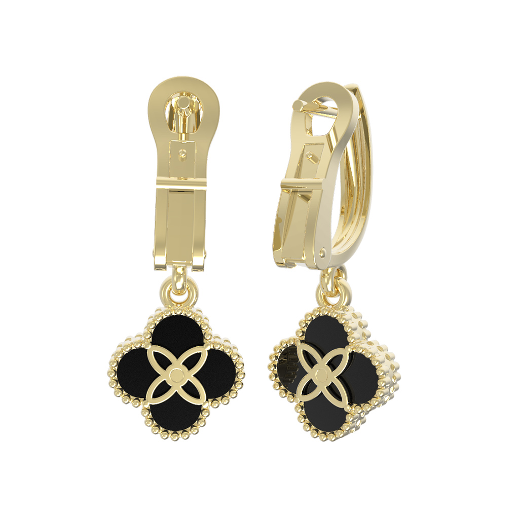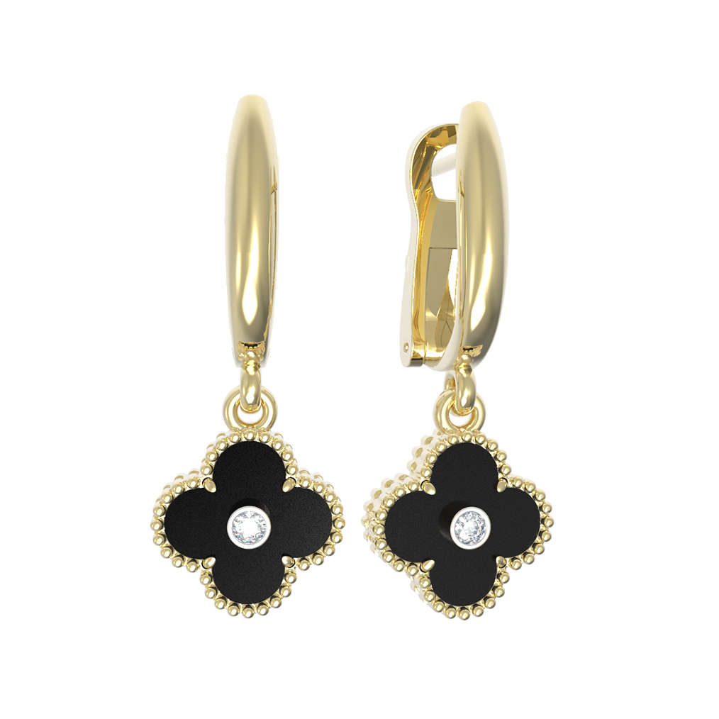 Центральным элементом композиции является выразительная вставка из глубокого черного оникса, окруженная сиянием благородного металла. В центре каждого элемента расположен яркий белый бриллиант круглой формы, который привносит в изделие игру света и легкое мерцание при каждом движении. Всего в серьгах использовано 4 вставки, гармонично сочетающих в себе строгость оникса и драгоценный блеск бриллиантов.