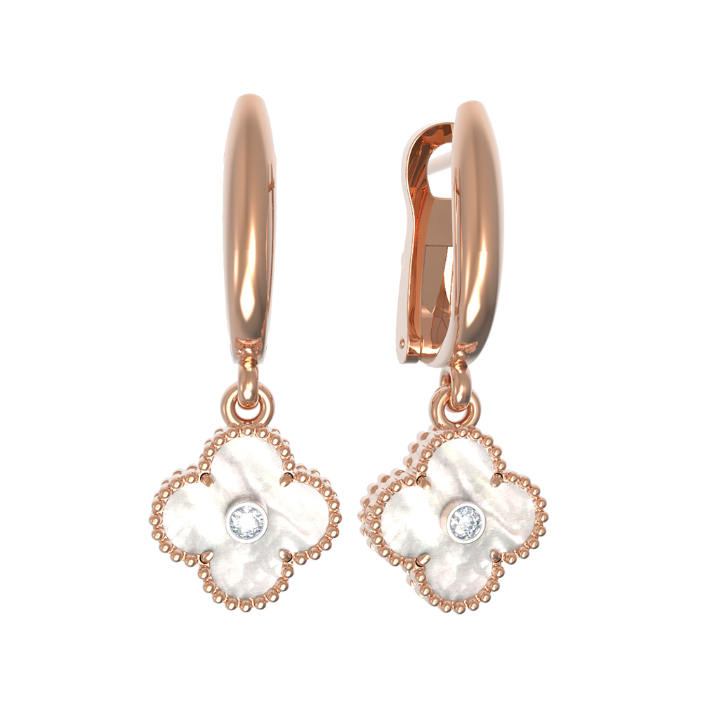 Элегантные и утонченные серьги из красного золота 585 пробы станут воплощением вашего безупречного вкуса. Дизайн изделия выполнен в форме изящного клевера, что придает украшению особое очарование и символический смысл. В центре каждой декоративной части расположен сверкающий бриллиант круглой огранки, который эффектно контрастирует с нежным перламутром белого цвета. Теплый оттенок красного золота гармонично подчеркивает сияние вставок, создавая атмосферу роскоши и гармонии.
