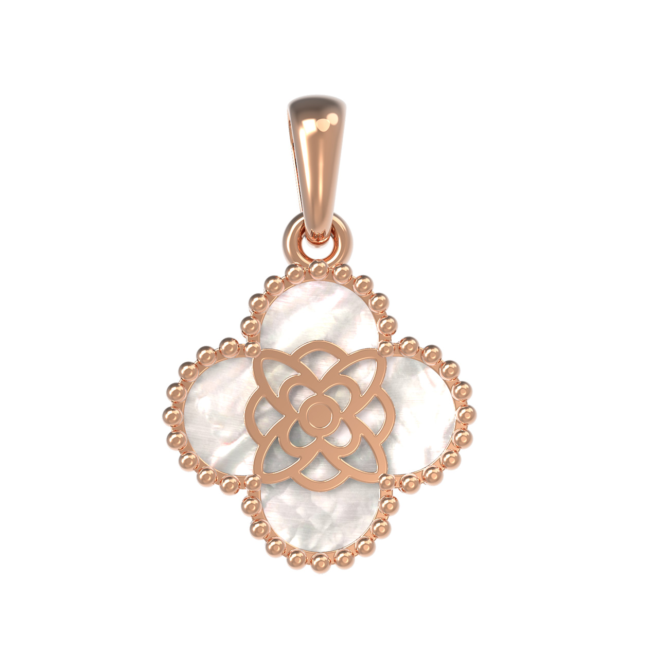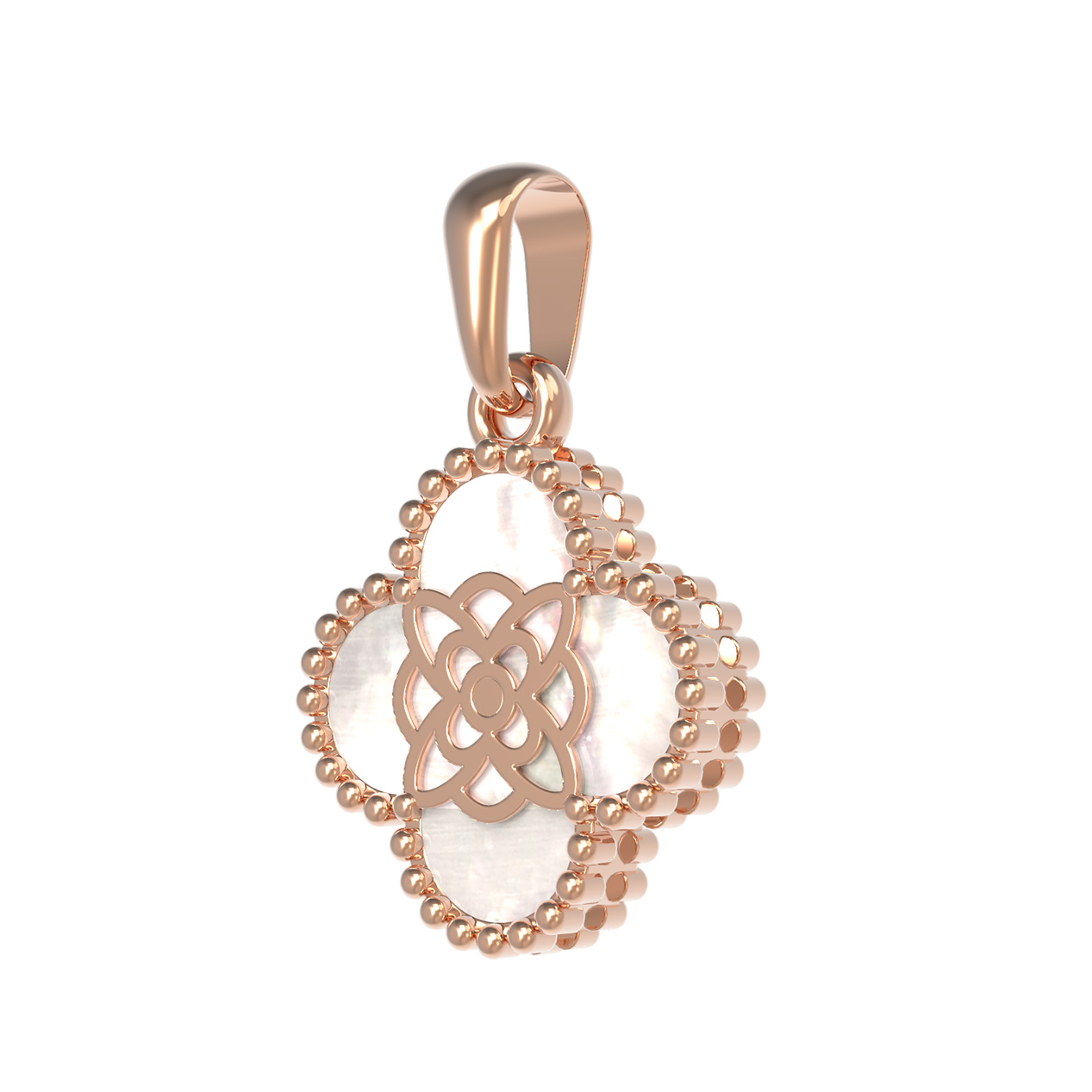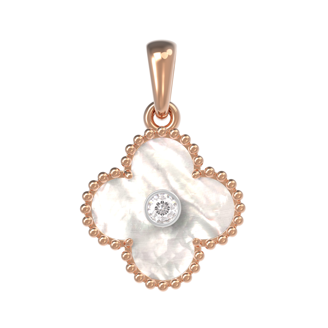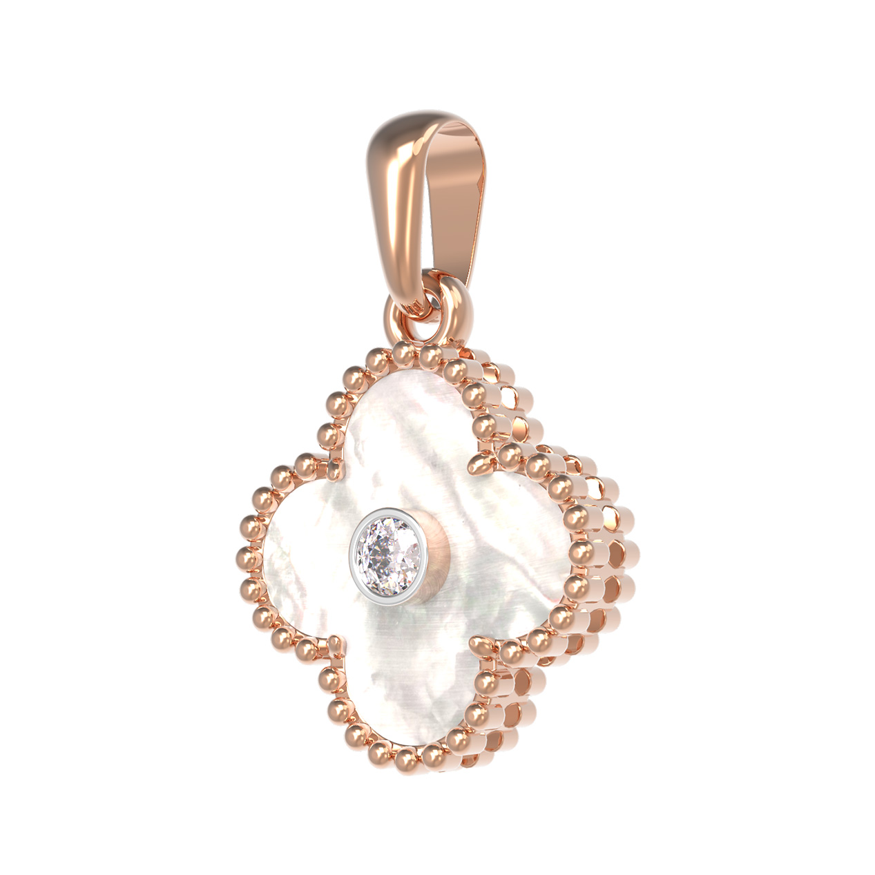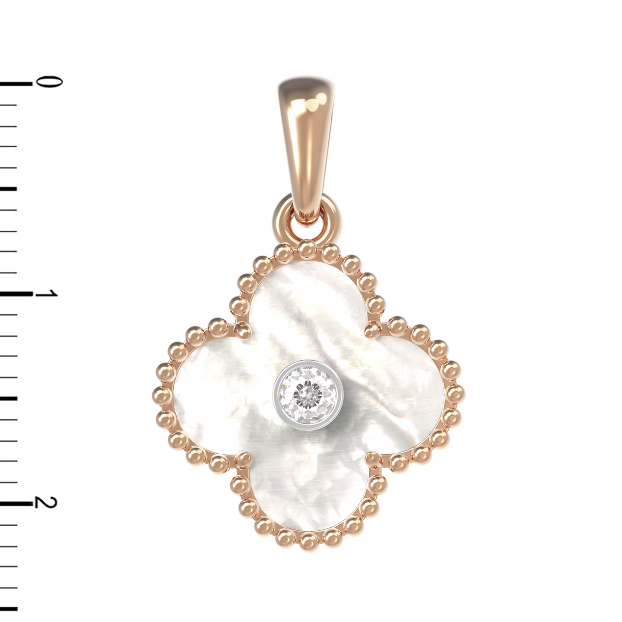 Центральным элементом композиции выступает перламутр с его неповторимыми переливами белого оттенка. В сердцевине декоративного элемента расположен один круглый бриллиант, чья чистота и блеск создают благородный контраст с матовой глубиной перламутровой вставки. Тщательно проработанная окантовка подчеркивает изящные контуры клевера, придавая изделию завершенный и выразительный вид.