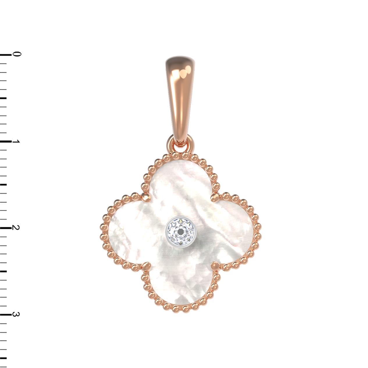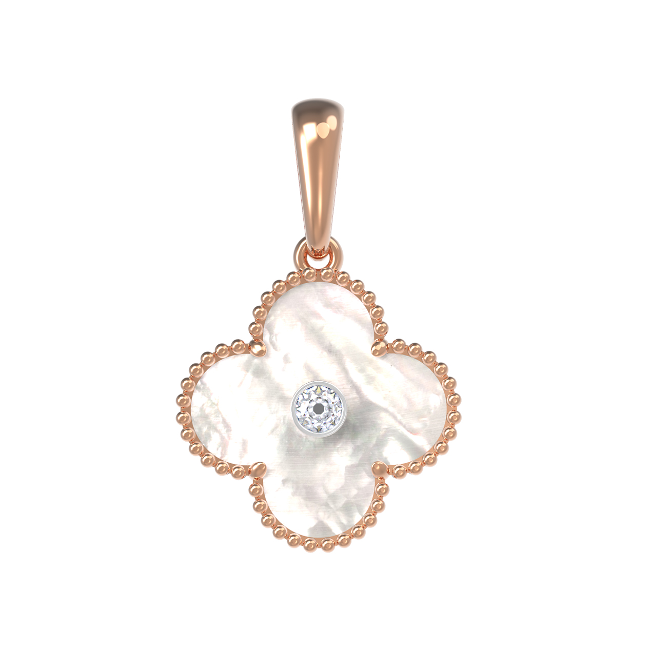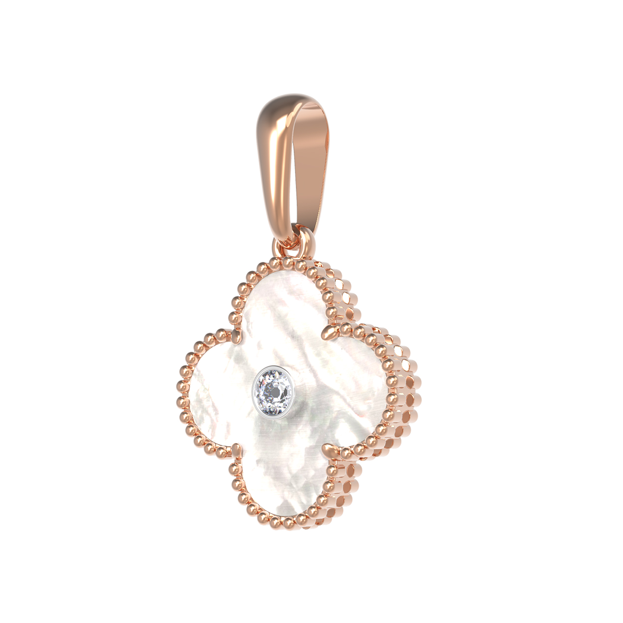В центре композиции расположен круглый бриллиант, окруженный нежной пластиной из белого перламутра. Контраст сверкающего камня и переливающегося перламутра создает неповторимый визуальный акцент, притягивающий взгляды. Изящная окантовка по периметру лепестков придает подвеске завершенность и благородство.
