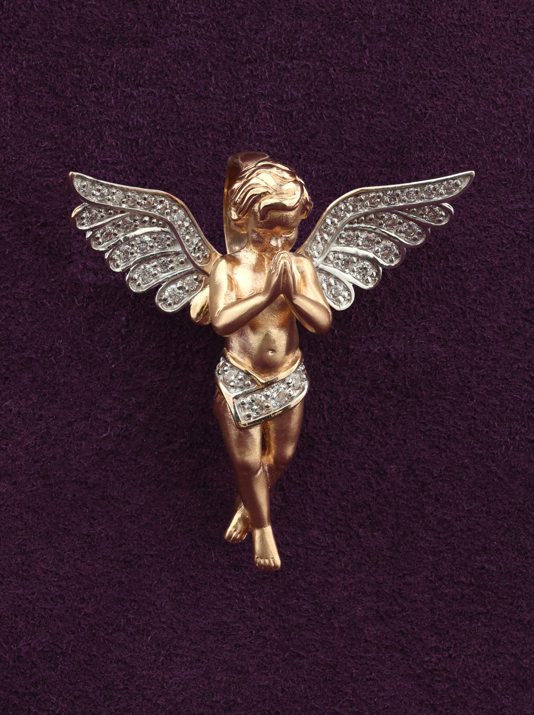 Данная подвеска из коллекции De Luxe — Купидоны украшена россыпью из 45 фианитов круглой формы. Белый цвет вставок эффектно контрастирует с красным золотом, создавая яркую игру света. Искусная инкрустация крыльев и драпировки купидона придает изделию роскошный и завершенный вид.