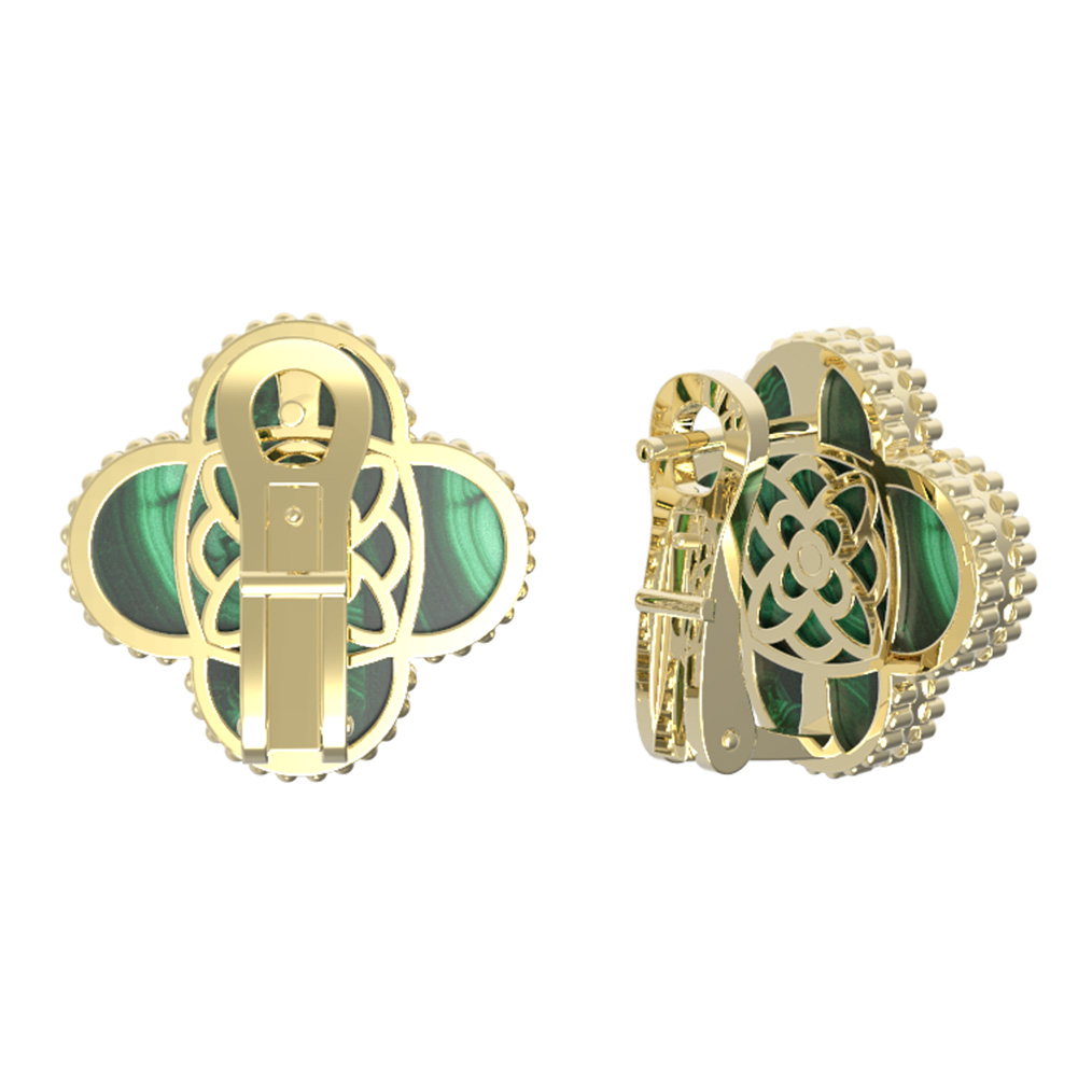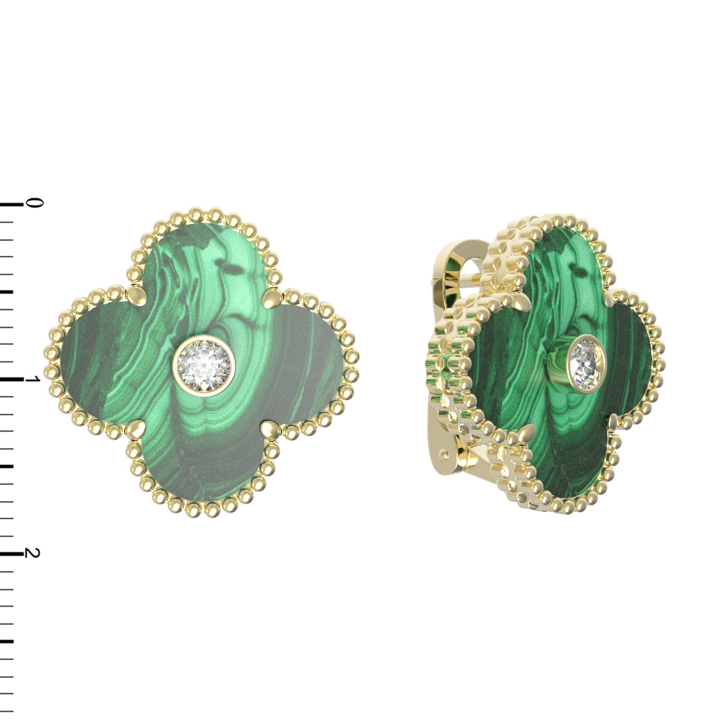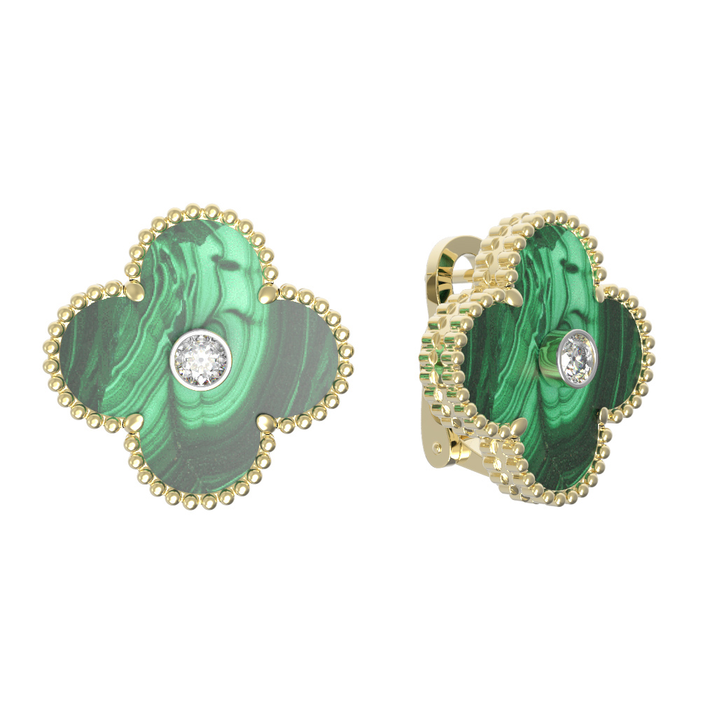 Серьги из коллекции De Luxe — Клевер — это изысканное сочетание благородного лимонного золота 585 пробы, глубокого зеленого цвета малахита и ослепительного блеска бриллиантов. Узнаваемый дизайн в форме клевера придает изделию особое очарование, делая его идеальным акцентом как для повседневного, так и для вечернего образа. Малахит с его неповторимым природным рисунком эффектно контрастирует с теплым оттенком драгоценного металла, создавая гармоничное и притягательное украшение.