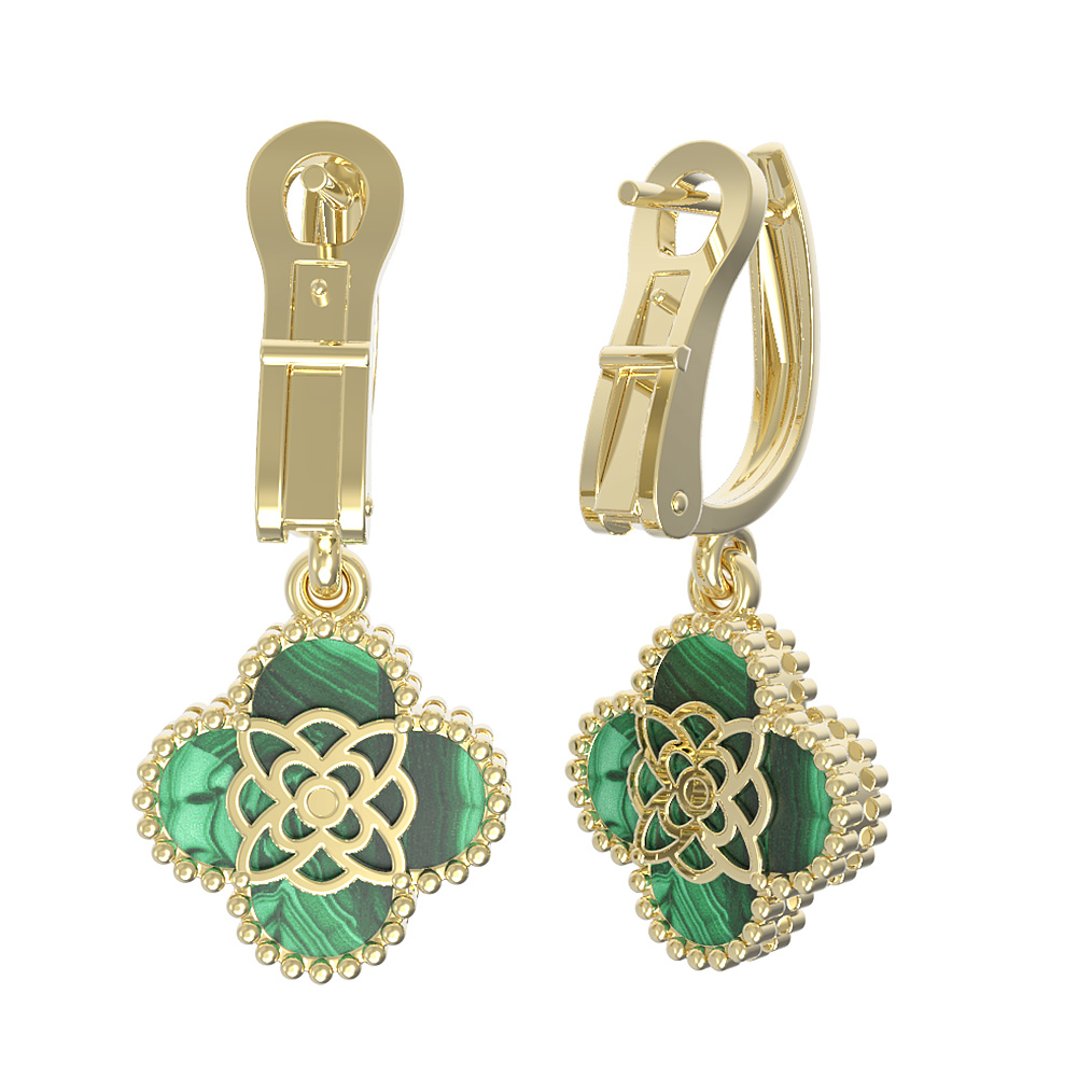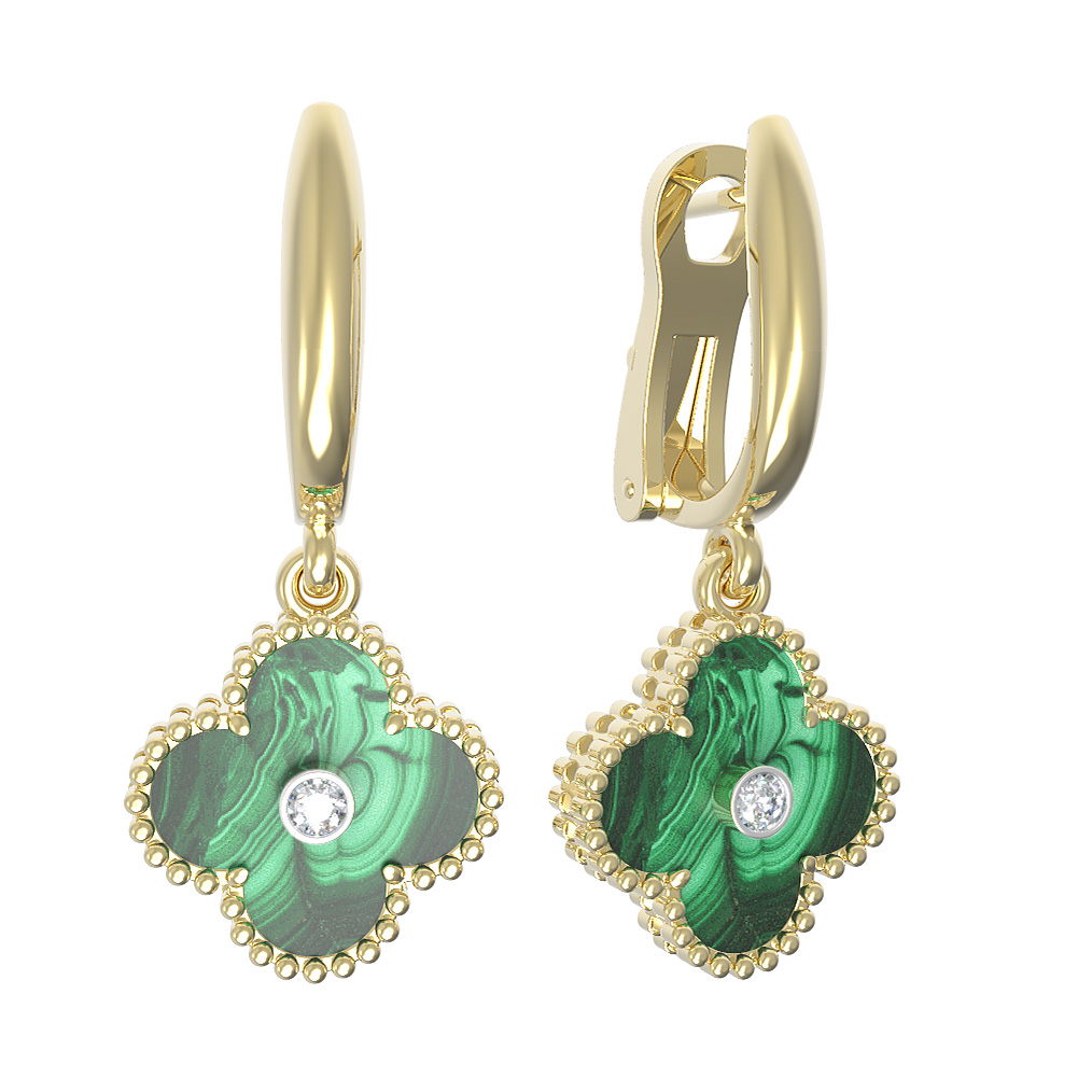 Откройте для себя воплощение утонченности в серьгах из лимонного золота 585 пробы, представленных в коллекции De Luxe — Клевер. Это украшение создано для тех, кто ценит гармонию формы и благородство материалов. Центральным элементом дизайна стал узнаваемый мотив клевер, символизирующий удачу и изысканный вкус. Глубокий, насыщенный зелёный цвет малахита великолепно сочетается с ярким оттенком лимонного золота, создавая выразительный акцент в вашем образе.