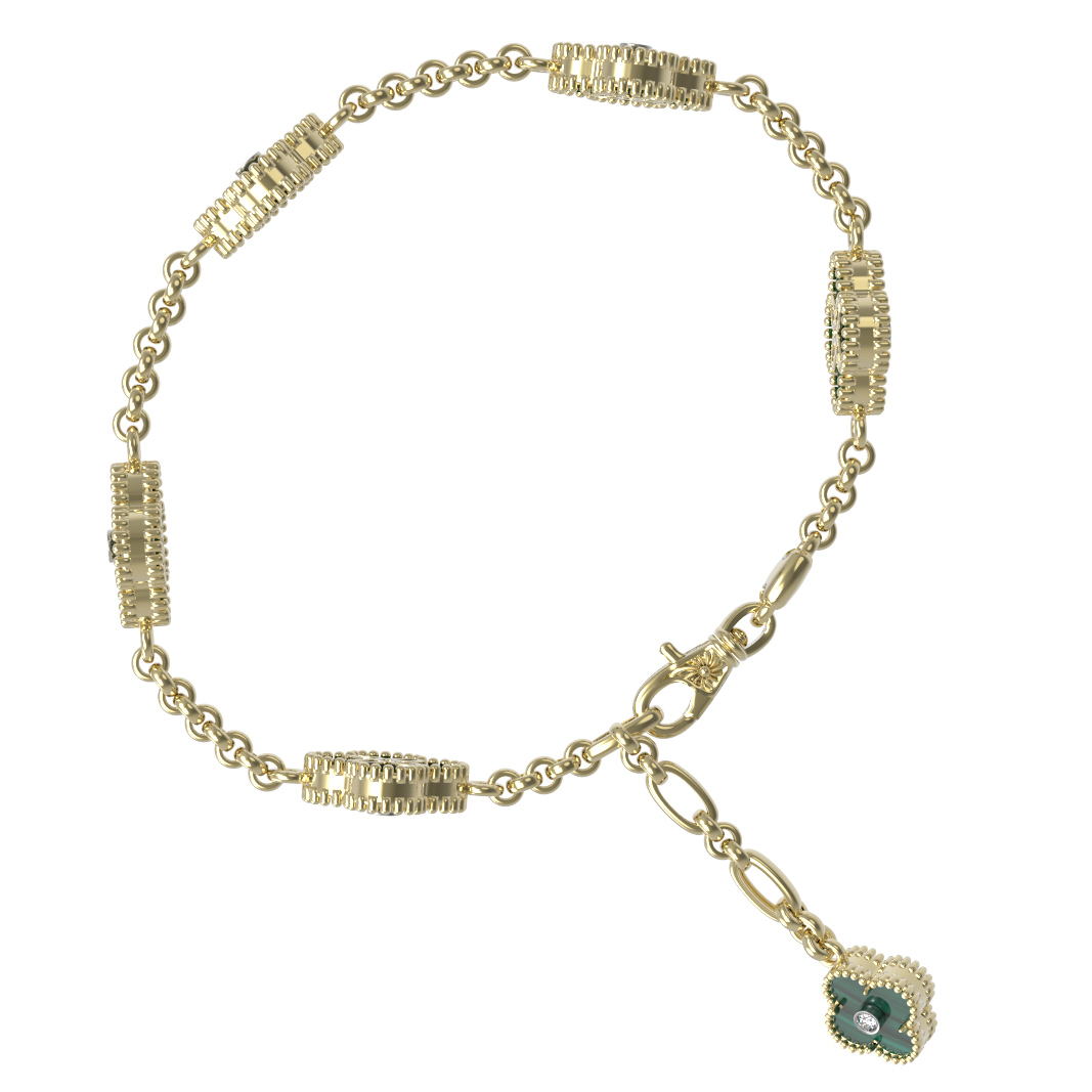 Изысканный браслет из лимонного золота 585 пробы станет утонченным дополнением вашего образа. Дизайн изделия вдохновлен символом удачи — легендарным клевером, который объединил в себе роскошь драгоценных материалов и классическую элегантность. Украшение из коллекции De Luxe — Клевер подчеркивает статус и безупречный вкус, гармонично дополняя как женский, так и мужской стиль.