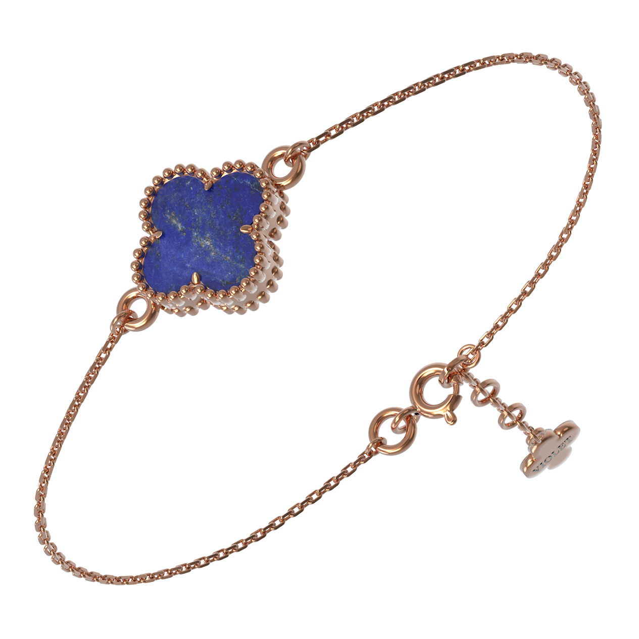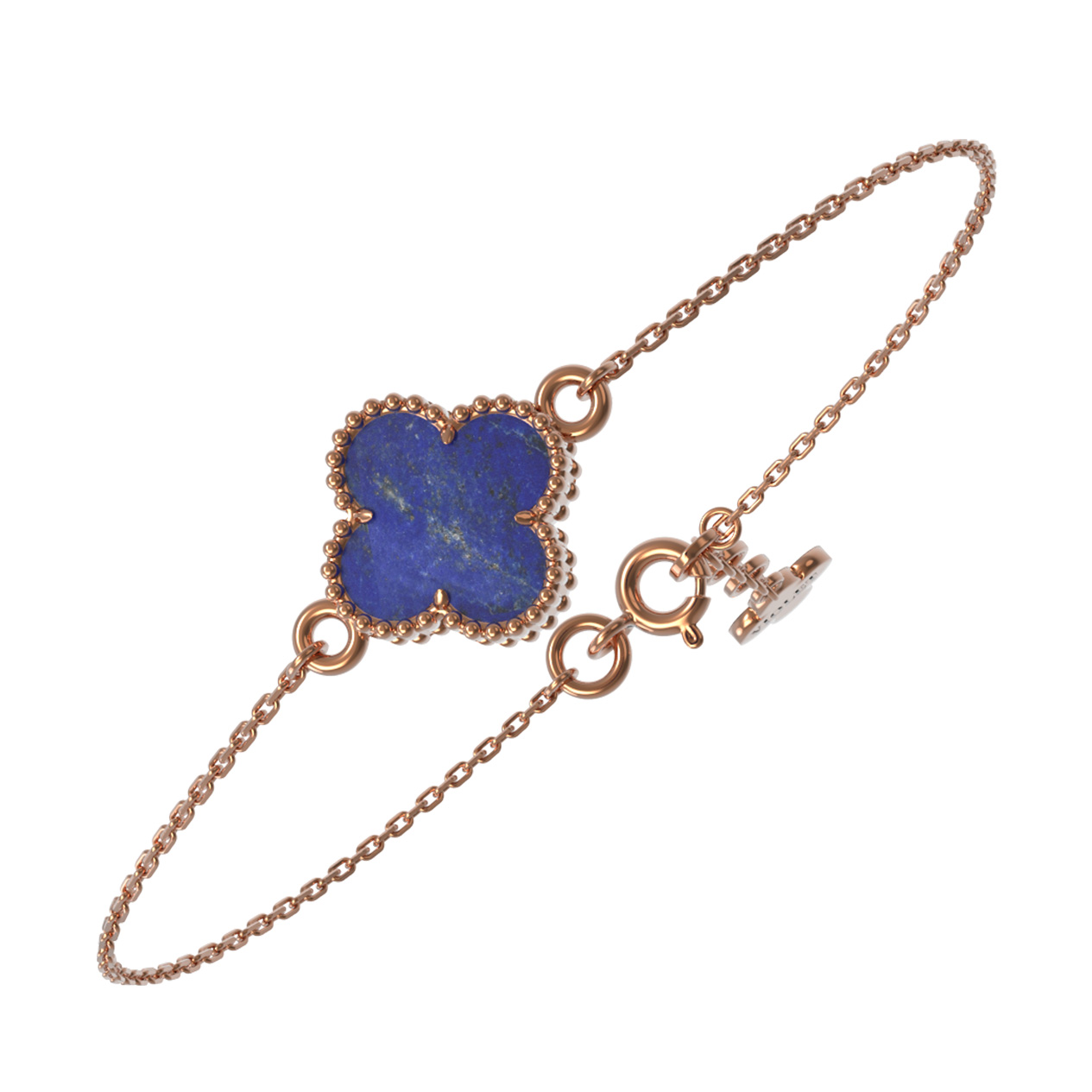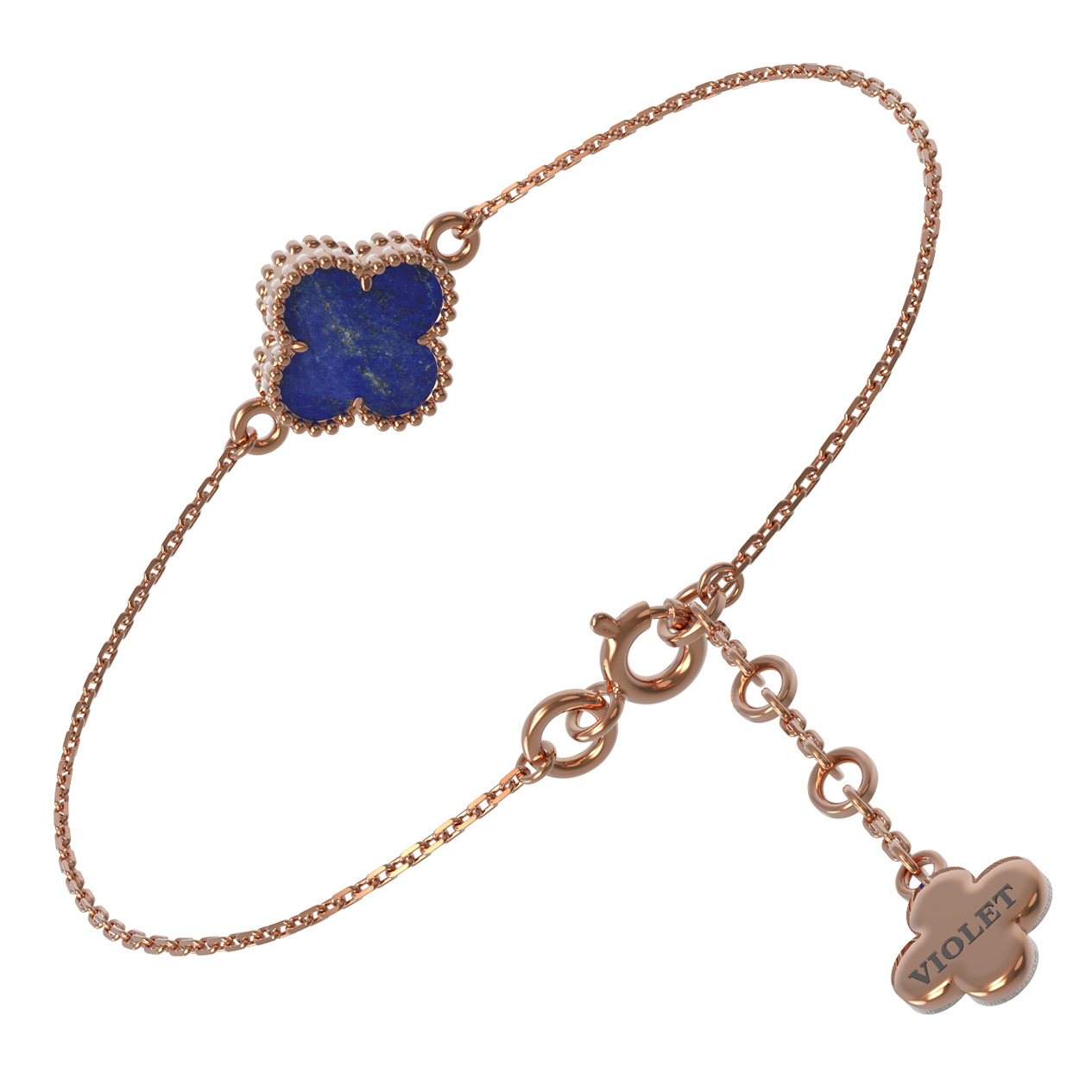Центральным элементом композиции является одна крупная вставка из натурального лазурита. Насыщенный синий цвет камня гармонично контрастирует с красным металлом, создавая глубокое и привлекательное сочетание. Оправа клевера украшена декоративными деталями, подчеркивающими природную красоту вставки.