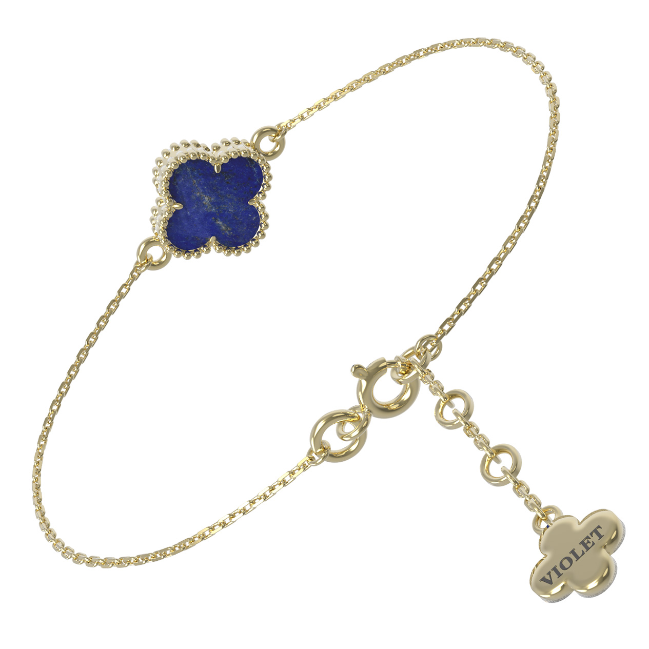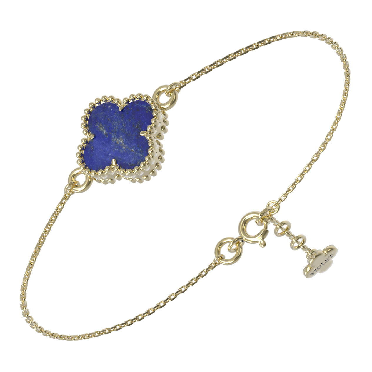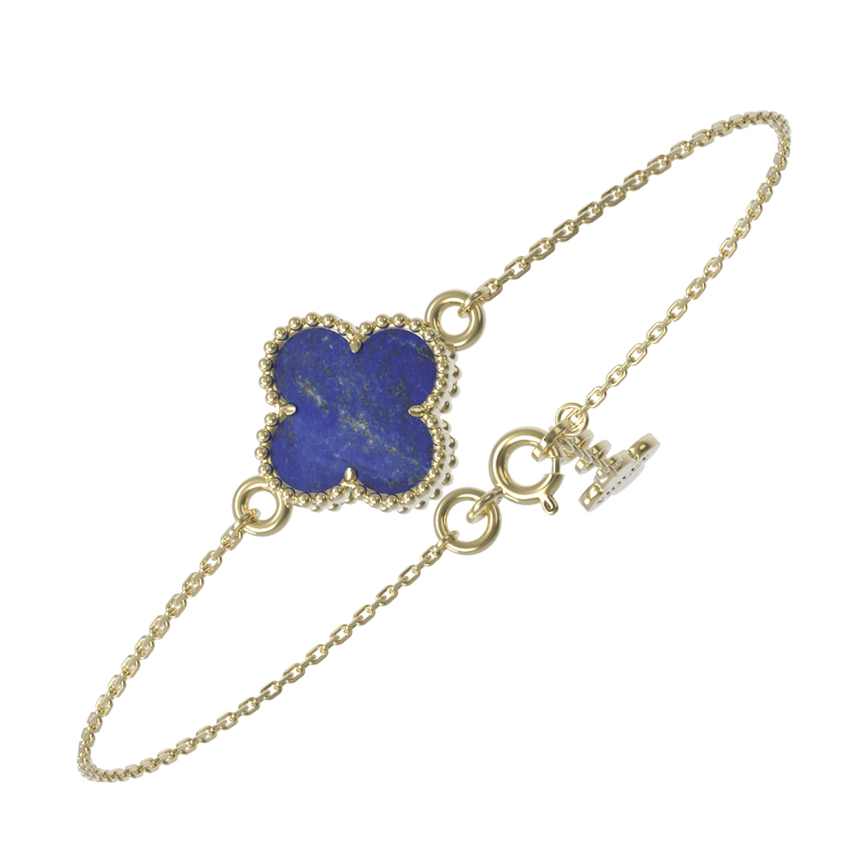 Лимонное золото подчеркивает насыщенный цвет лазурита, создавая контрастное и притягательное сочетание. Изящная цепочка, на которой закреплен единственный клевер, делает модель легкой и невесомой, что позволяет комфортно носить браслет на запястье в течение всего дня. Это универсальное изделие подходит как для женщин, так и для мужчин, предпочитающих лаконичные и стильные аксессуары в своем гардеробе.