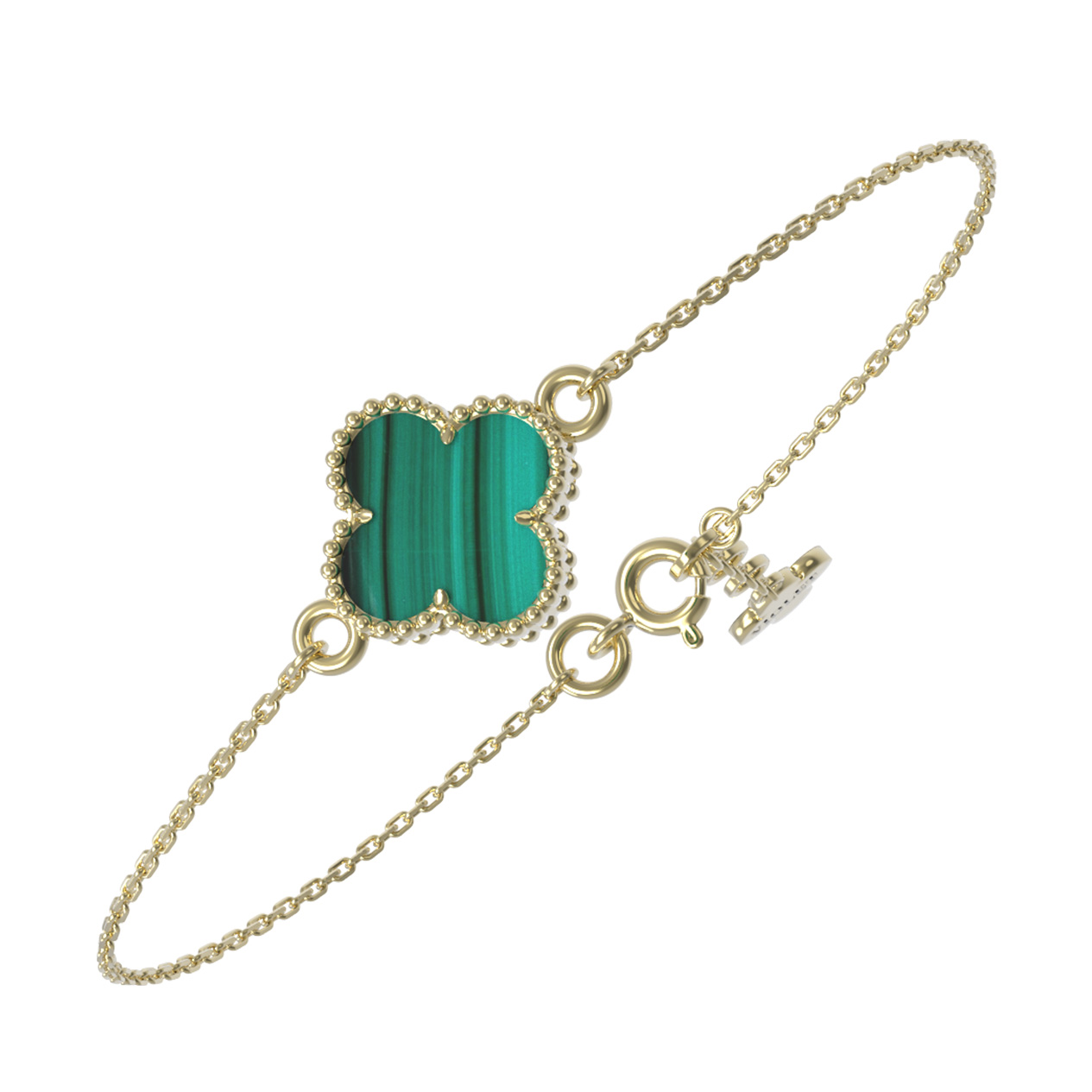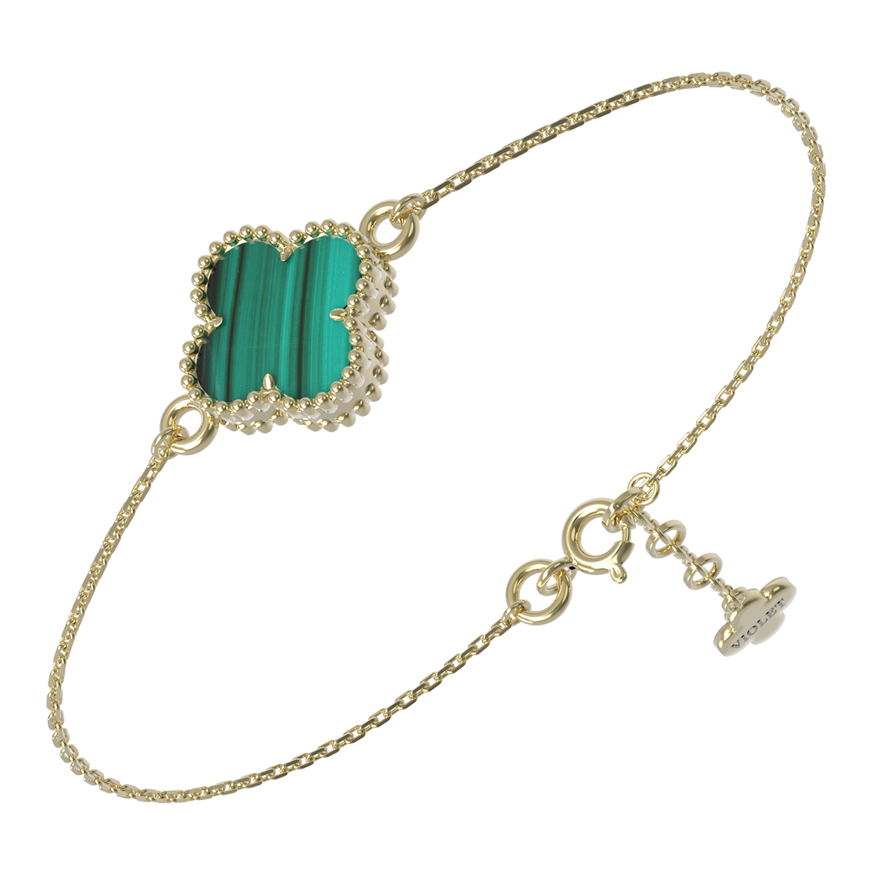 Элегантный браслет из лимонного золота 585 пробы станет изысканным акцентом вашего образа. Дизайн украшения выполнен в форме четырехлистного клевера — символа удачи и гармонии. Центральным элементом изделия служит одна вставка из натурального малахита с неповторимым природным рисунком. Насыщенный зелёный цвет камня эффектно контрастирует с теплым блеском металла, создавая притягательный и благородный вид. Этот аксессуар относится к коллекции De Luxe — Клевер, отражающей безупречный вкус и внимание к деталям.