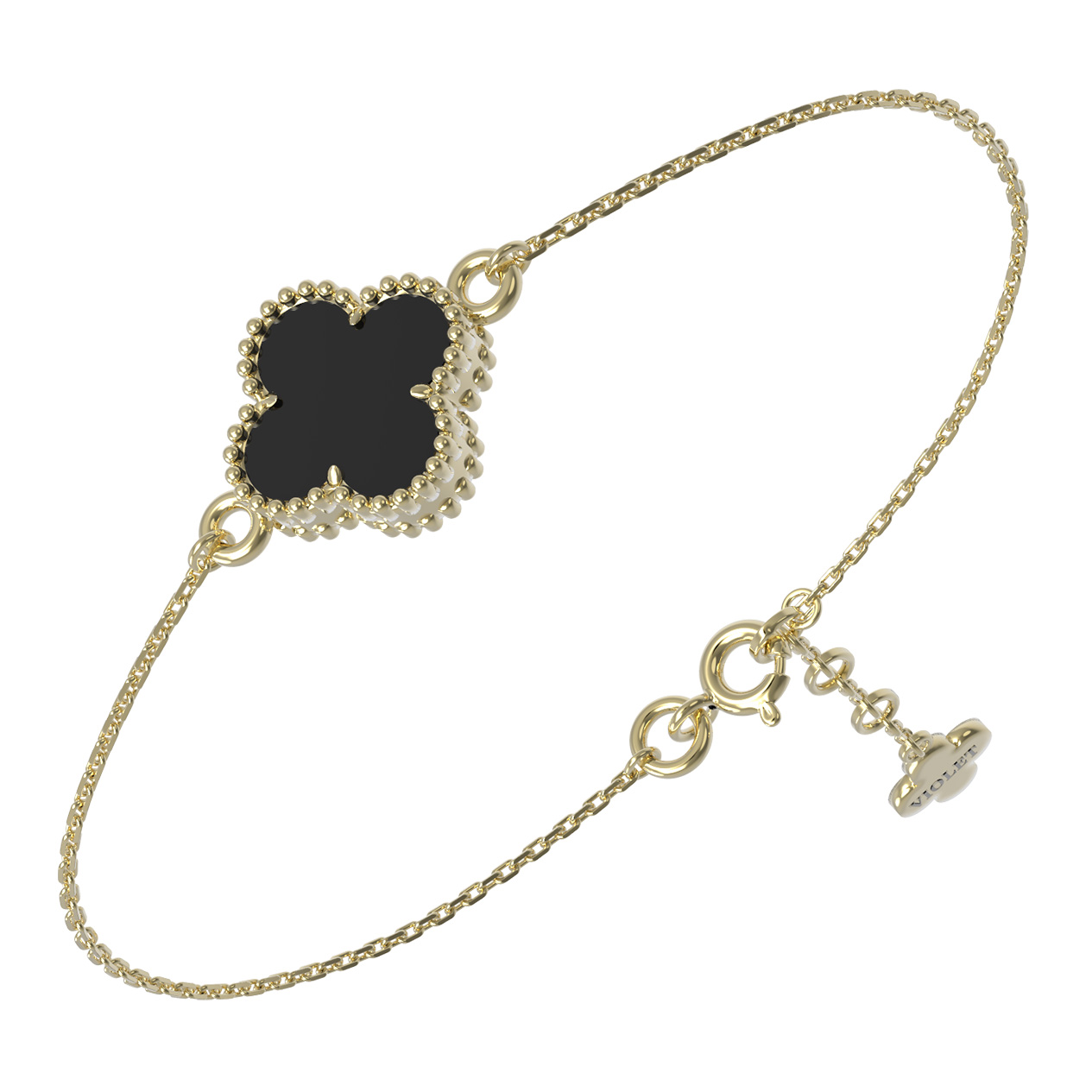 Изысканный браслет из лимонного золота 585 пробы станет ярким акцентом вашего образа. Это украшение, вдохновленное природными мотивами, представлено в элегантном дизайне «Клевер», который давно стал классикой ювелирного искусства. Центральным элементом композиции является одна крупная вставка из благородного оникса насыщенного черного цвета. Глубокий оттенок камня идеально сочетается с теплым, солнечным сиянием лимонного золота, создавая изысканный контраст, подчеркивающий безупречный вкус владельца.