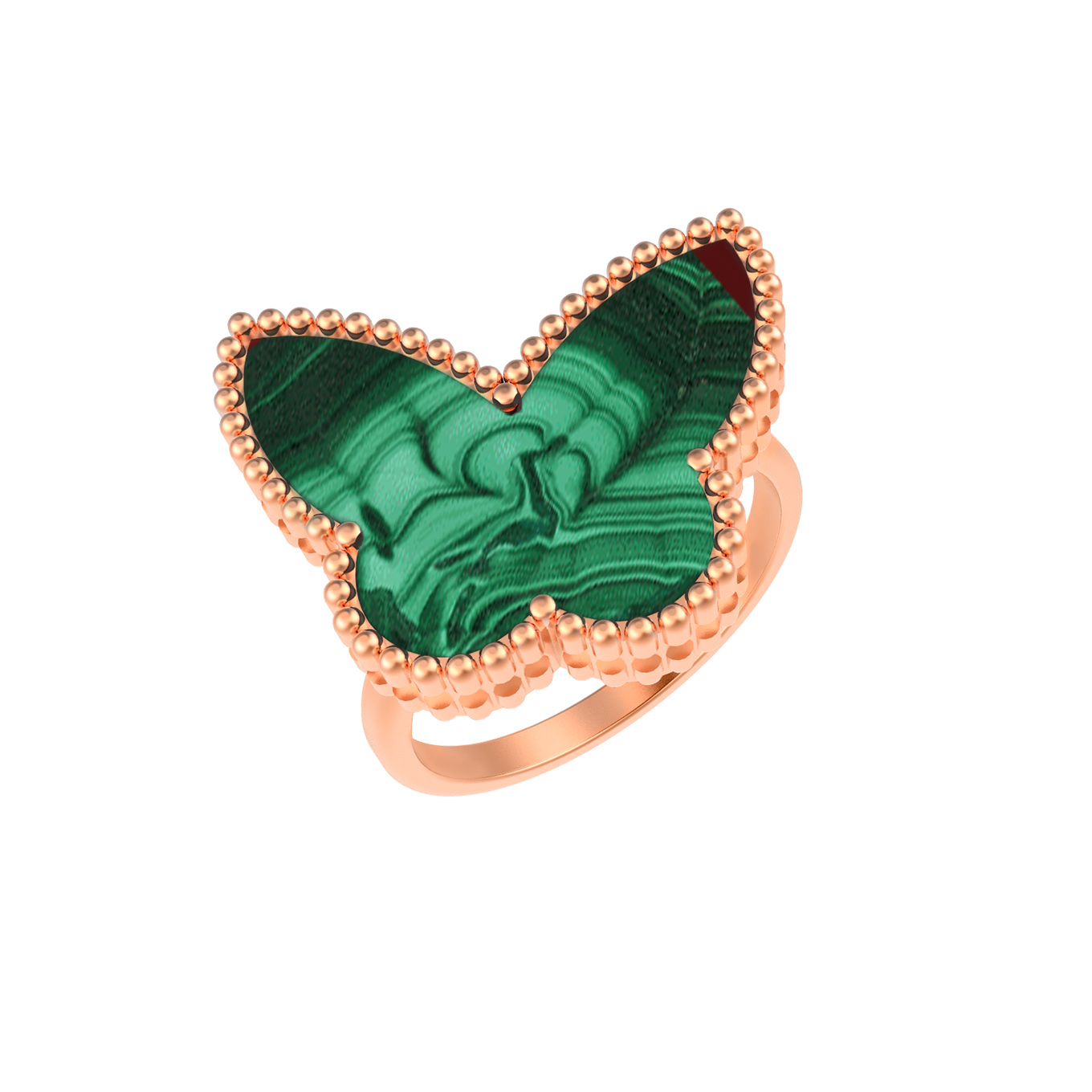 Изысканное кольцо из красного золота 585 пробы из коллекции De Luxe — Бабочки станет утонченным акцентом вашего образа. Дизайн украшения, выполненный в форме бабочки, привлекает внимание своей грацией и легкостью, подчеркивая безупречный вкус владельца. В центре композиции расположена эффектная вставка из малахита насыщенного зеленого цвета, которая придает изделию природную глубину и благородство.