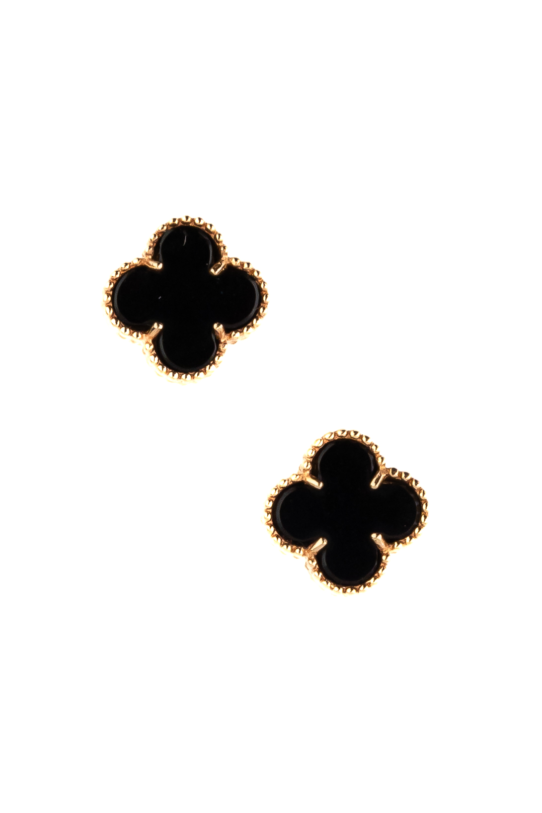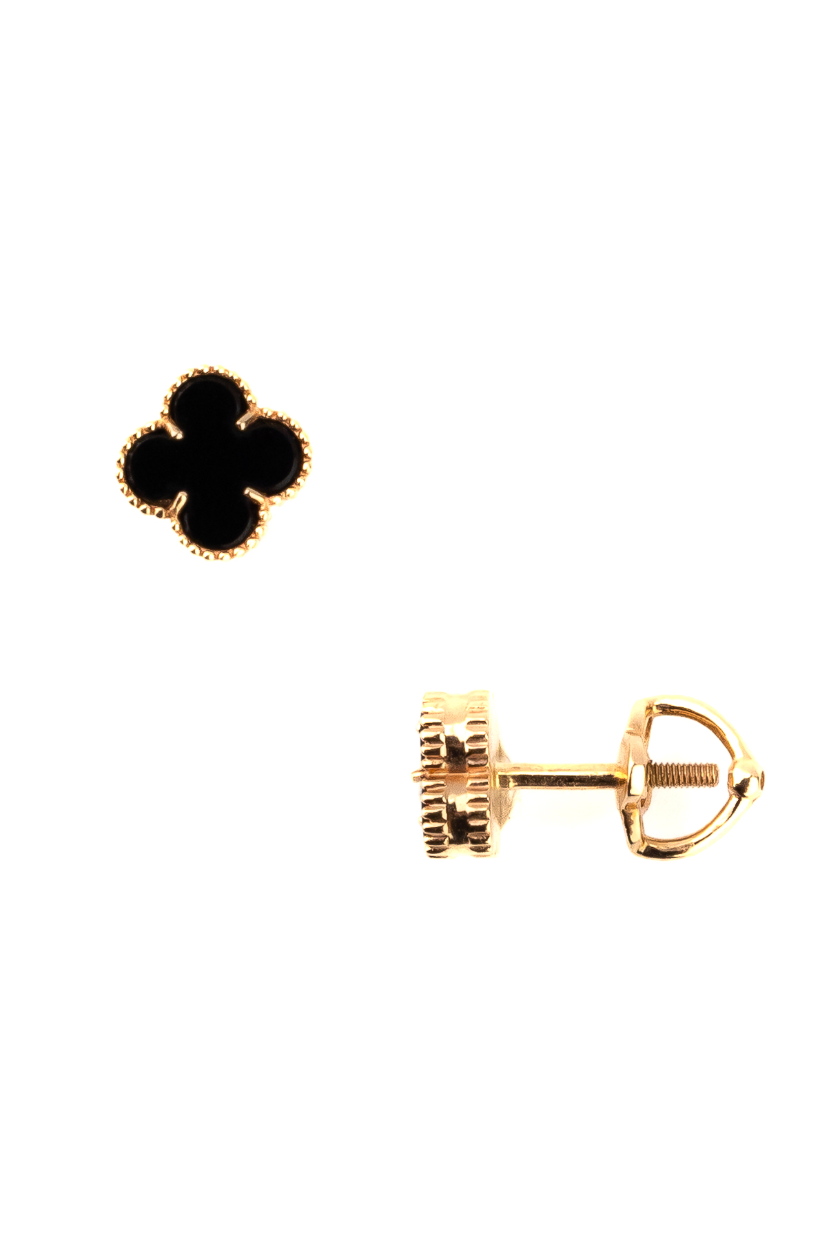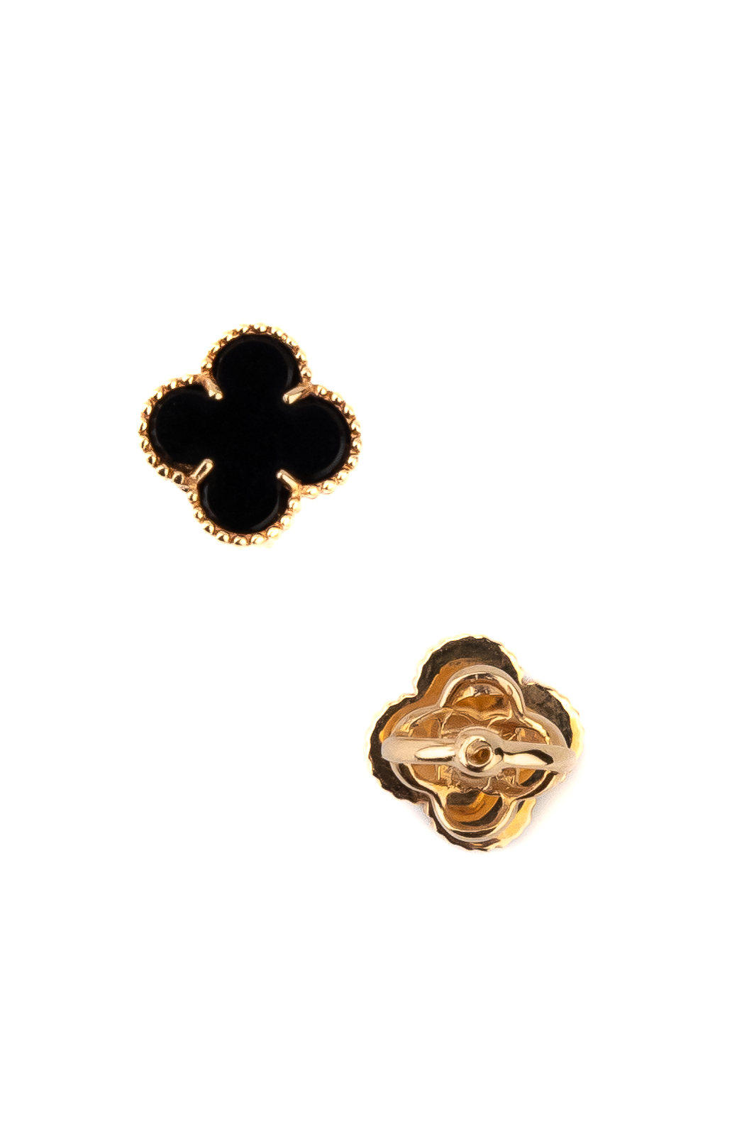 Главным акцентом модели выступает классический дизайн в форме клевера — символа удачи и гармонии. В центре каждого изделия расположен черный оникс, чья насыщенная палитра эффектно контрастирует с благородным металлом. Две вставки из натурального камня придают украшению особую глубину и выразительность.