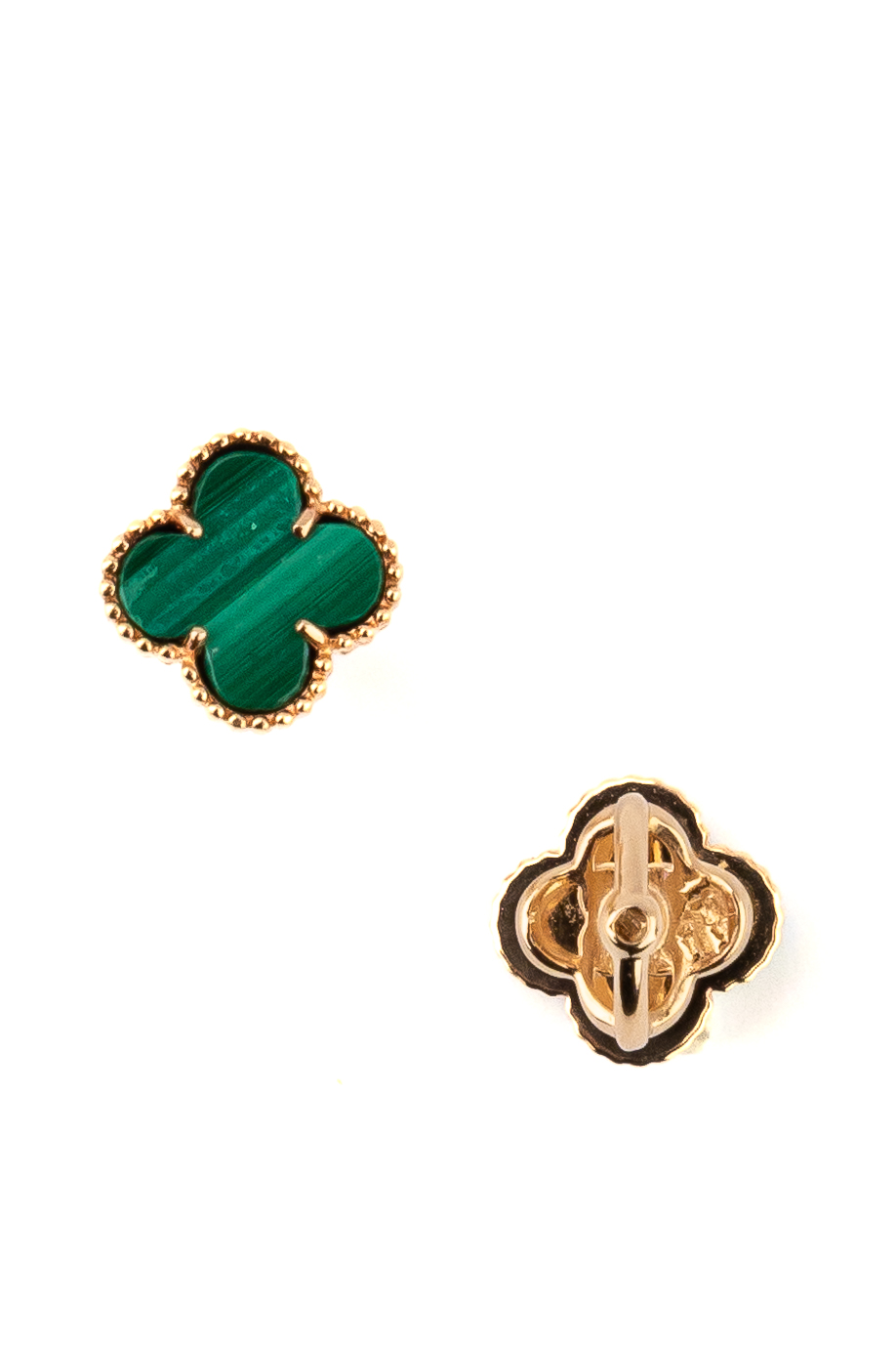 Главным акцентом изделий является глубокий зелёный цвет вставок из натурального малахита. В каждой серьге расположено по одной вставке, чьи природные узоры создают уникальный рисунок на поверхности камня. Насыщенный оттенок малахита гармонично сочетается с теплым блеском красного золота, создавая выразительный контраст. Эти серьги — это классика, прошедшая сквозь время и воплощенная в благородных материалах.