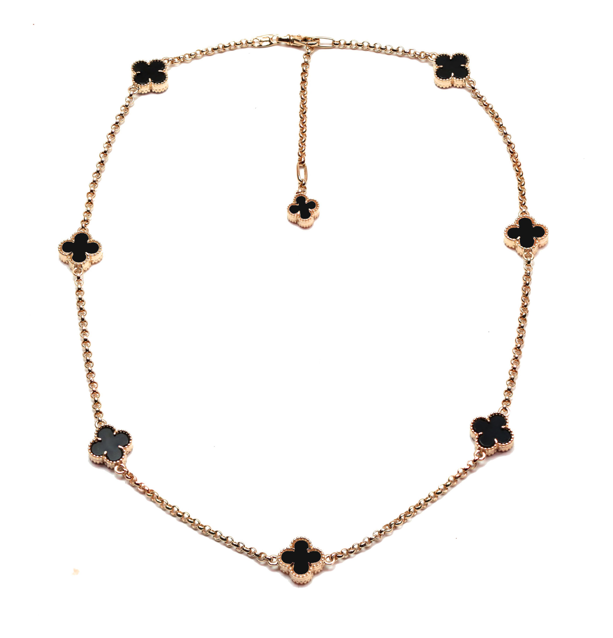 Элегантное колье из красного золота 585 пробы станет изысканным акцентом вашего образа. Дизайн украшения, выполненный в форме клевера, является воплощением утонченного стиля и лаконичности. Вдоль цепочки гармонично расположились восемь вставок из оникса глубокого черного цвета, которые создают эффектный контраст с теплым оттенком благородного металла.