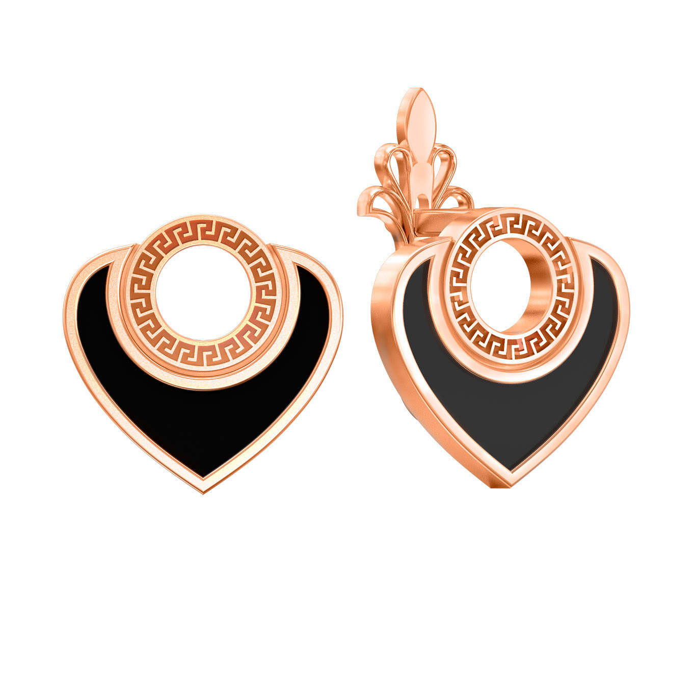 Центральным элементом композиции является выразительный дизайн в форме сердец, который придает украшению романтичный и при этом статусный вид. Каждая серьга инкрустирована вставкой из оникса черного цвета, подчеркивающей контрастность и графичность исполнения. Особую художественную ценность модели придает детализированная проработка золотой поверхности, отсылающая к античным мотивам.
