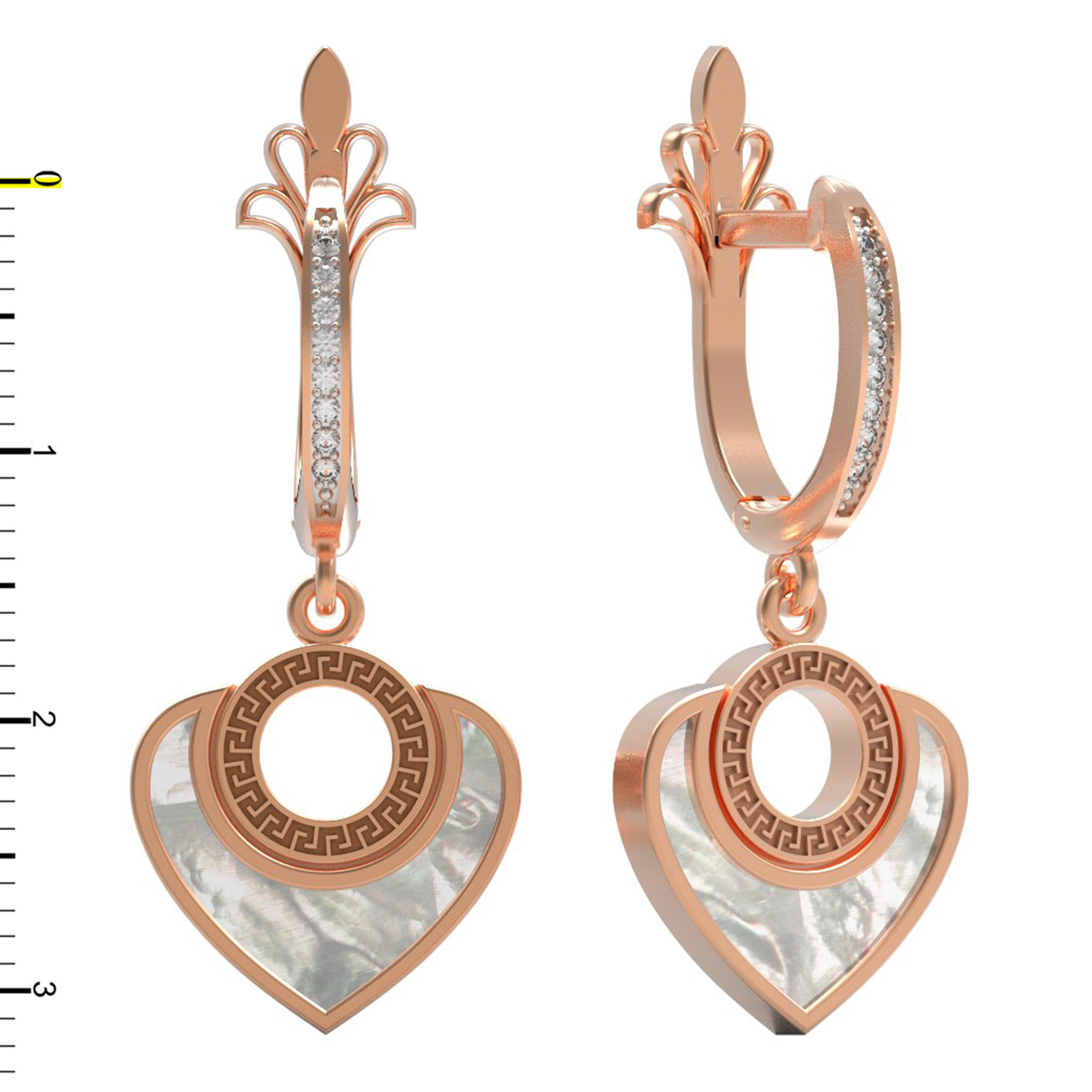 Роскошь красного золота гармонично дополняется деликатным сиянием вставок: нежного перламутра с характерным переливом и 16 сверкающих фианитов белого цвета. Фианиты инкрустированы в линию основания, создавая мягкий акцент и завершенность композиции. Эти серьги созданы для тех, кто ценит эстетику и качество. Данное изделие прекрасно сочетается с другими украшениями, позволяя создавать полноценные комплекты.