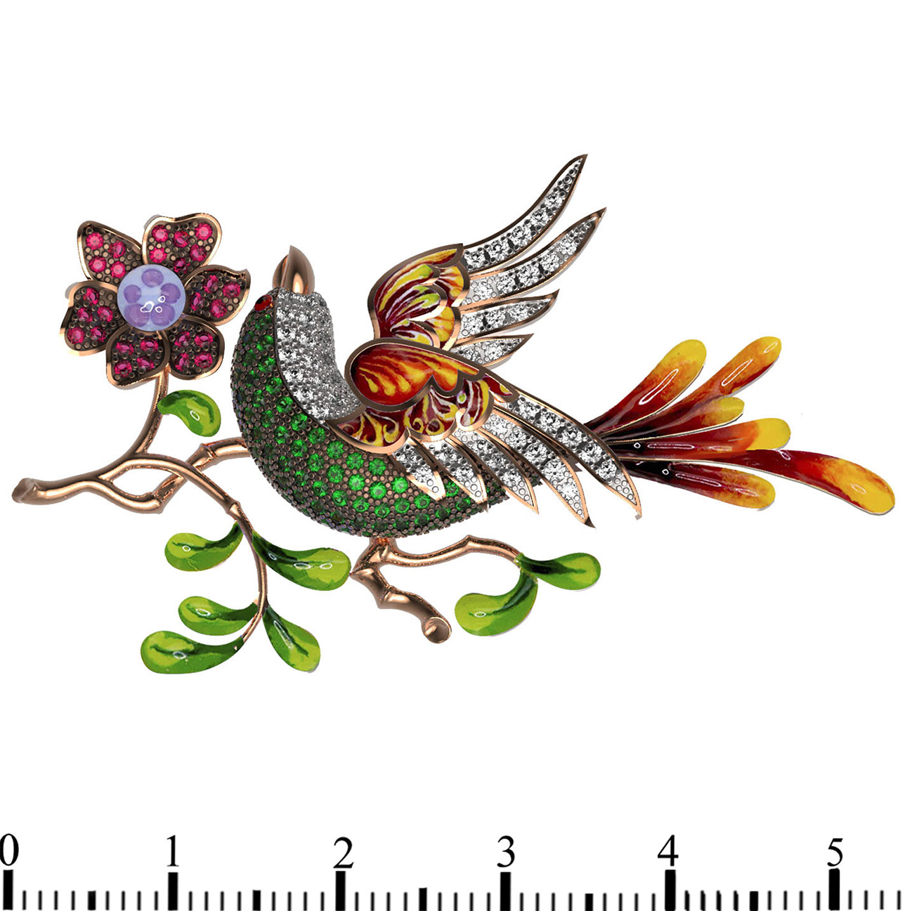 Особую художественную ценность броши придает мастерски нанесенная эмаль оранжевого цвета, которая в сочетании с теплым оттенком красного золота создает выразительный контраст. Изысканность изделия подчеркивают 167 вставок из фианита круглой формы, сверкающих белым блеском и создающих эффектную игру света при каждом движении. Внимание к деталям превращает эту брошь в настоящий предмет ювелирного искусства, который привлекает восхищенные взгляды.