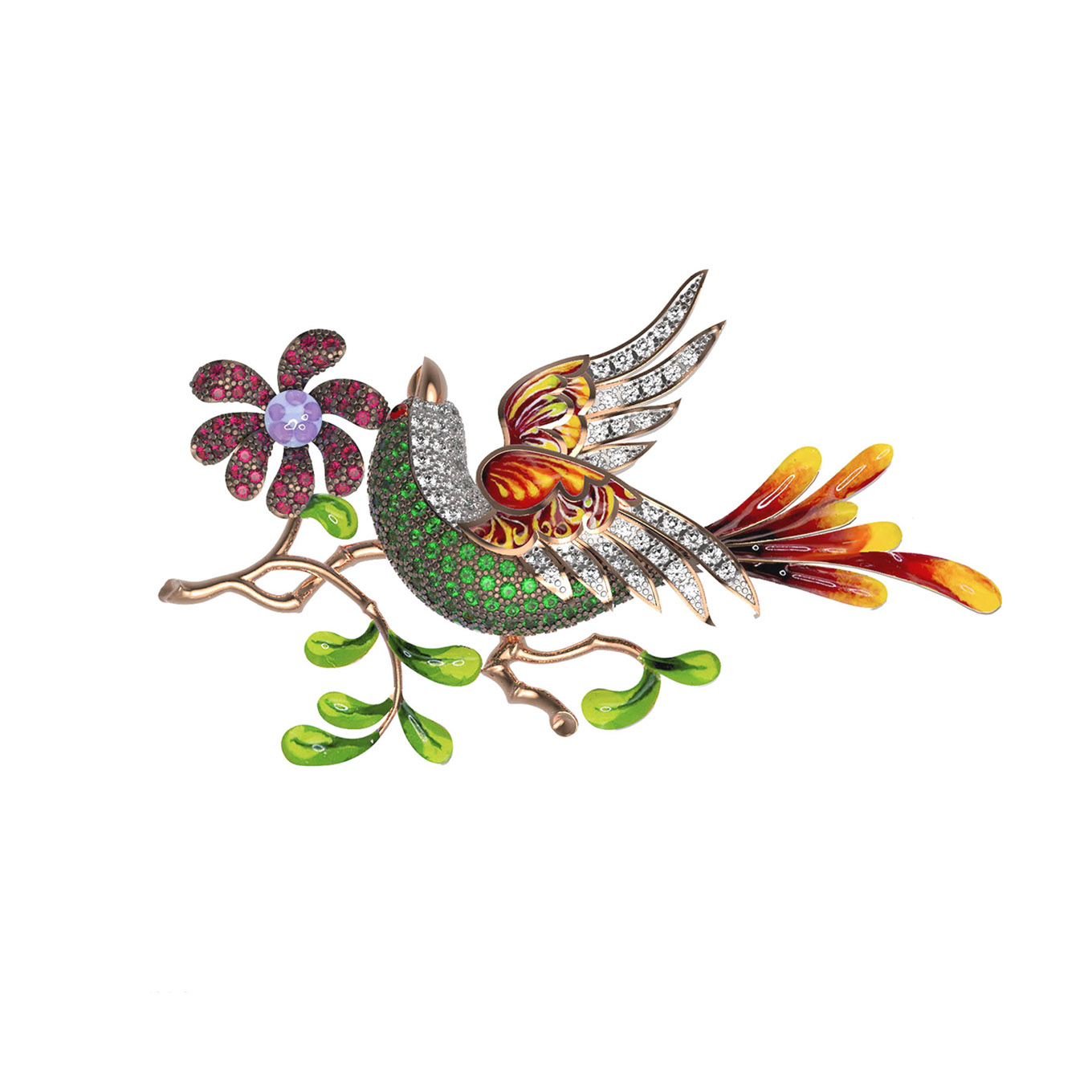 Роскошная брошь в виде изящной птицы из коллекции De Luxe — Райские птицы станет центральным акцентом вашего образа, подчеркивая утонченный вкус и индивидуальность. Это уникальное ювелирное изделие, выполненное в красном золоте 585 пробы, гармонично сочетает в себе мастерство исполнения и художественную выразительность. Дизайн в виде птицы, сидящей на ветке, наполнен динамикой и природной грацией, что делает украшение подходящим как для женщин, так и для мужчин.