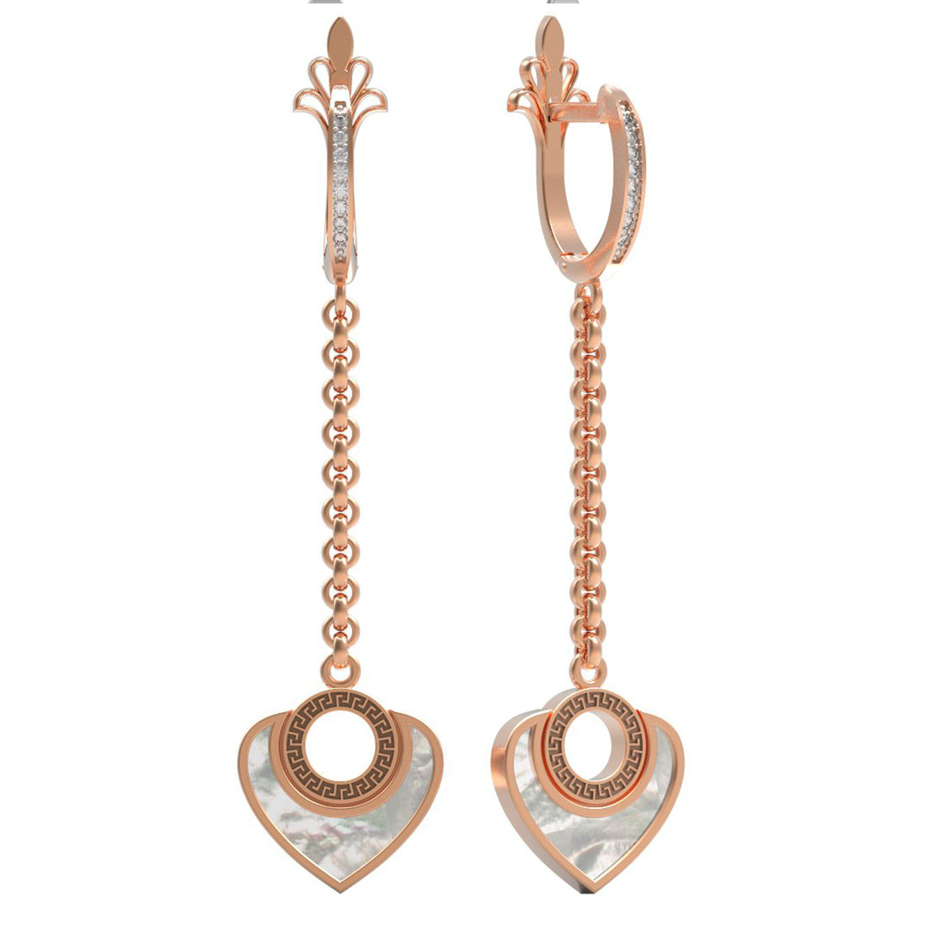 Дизайн дополнен геометрическими элементами с греческим орнаментом, который обрамляет круглые вставки из перламутра, создавая эффектный контраст. Ювелиры использовали 16 вставок, включая сияющие фианиты белого цвета, которые украшают основание серег, добавляя блеска при каждом движении. Длинные цепочки делают модель легкой и динамичной, превращая серьги в идеальный аксессуар для завершения вечернего или коктейльного образа.