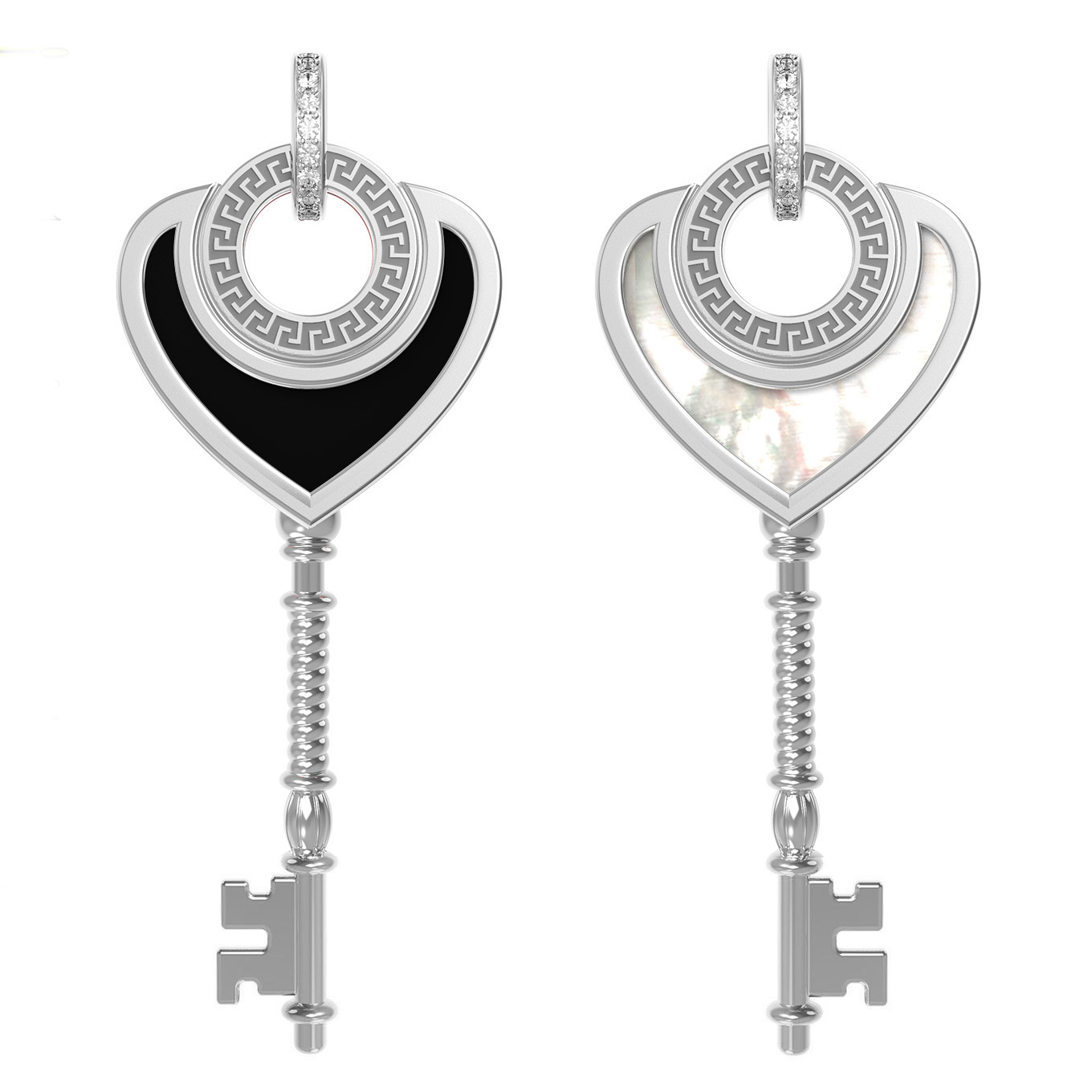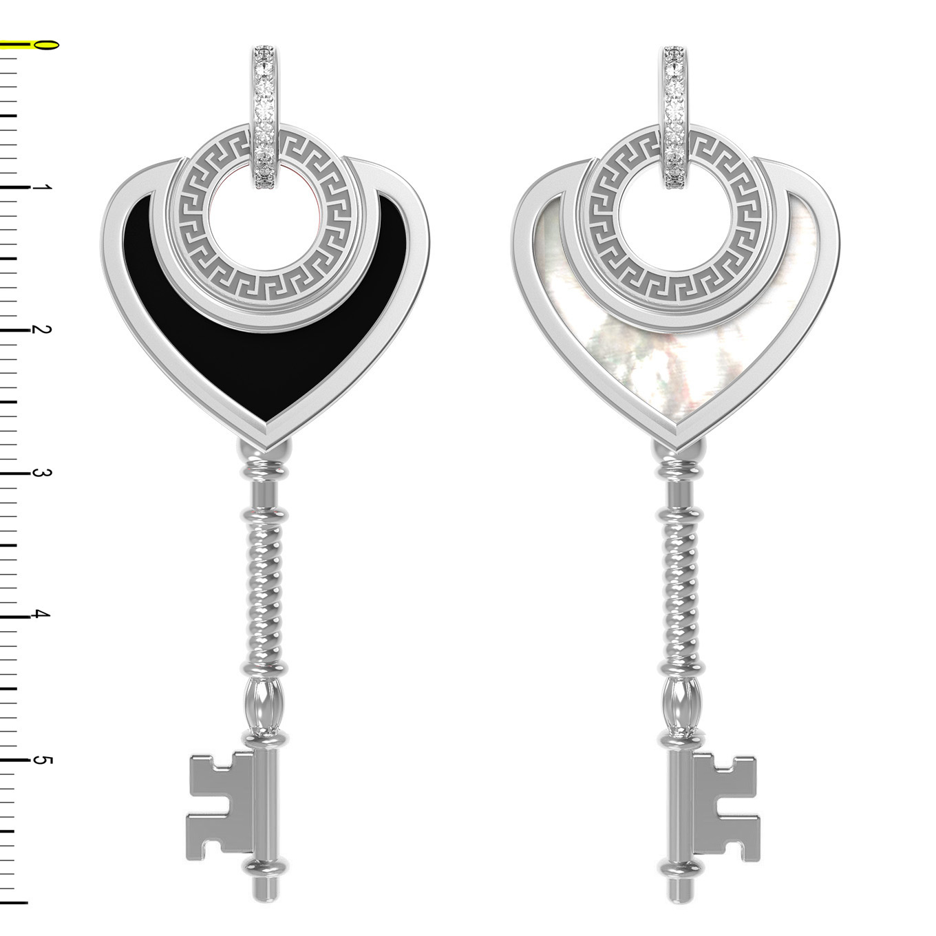 Центральным элементом композиции является искусное сочетание материалов. Основу ювелирного украшения составляет качественное белое золото, которое эффектно подчеркивает холодное сияние вставок. В дизайне использовано 19 вставок, создающих глубокий контраст: насыщенный черный оникс и нежный переливчатый перламутр круглой и сердцевидной формы. Дополнительную выразительность изделию придает россыпь сверкающих фианитов, добавляющих легкое мерцание при каждом движении.