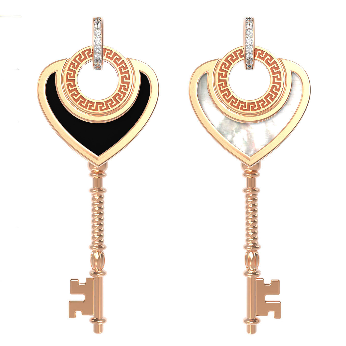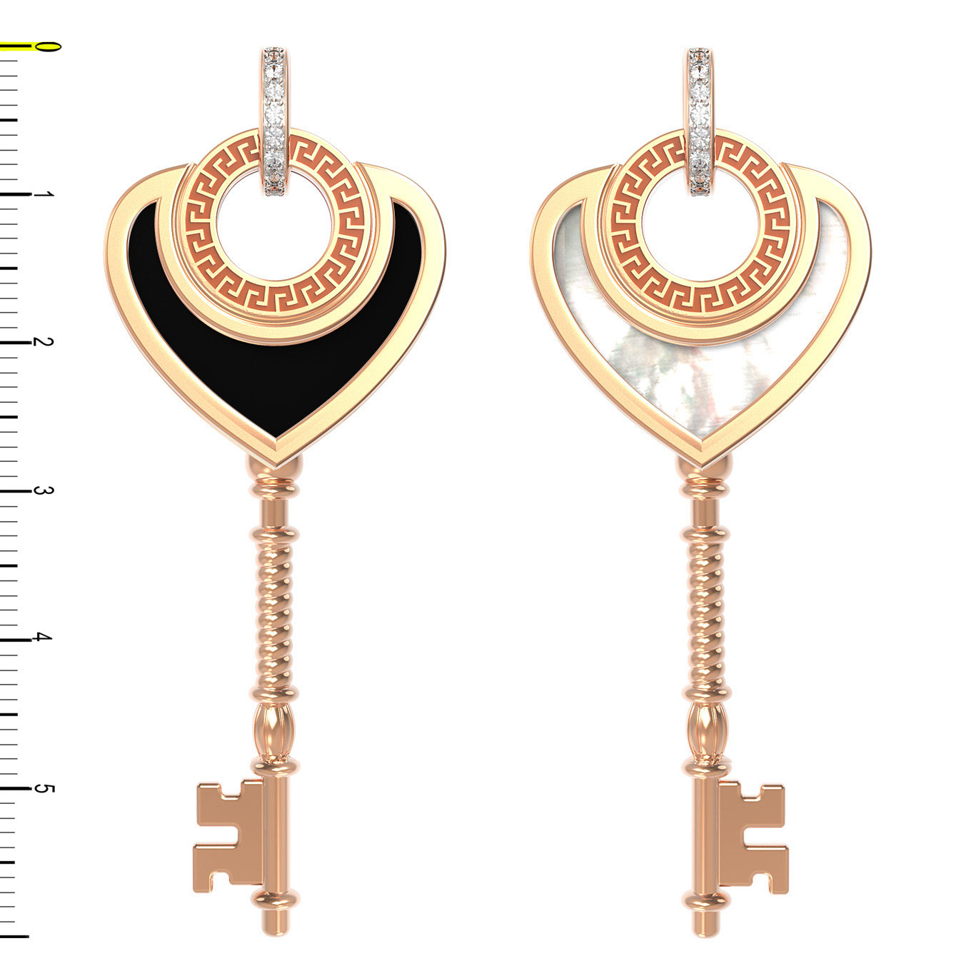 В центре внимания — искусное сочетание контрастных материалов. Вставка из глубокого черного оникса и нежного перламутра создает неповторимую игру оттенков, подчеркивая благородство красного золота. Геометрические формы вставок в виде круга и сердца гармонично дополнены 19 сияющими фианитами белого цвета, которые добавляют изделию мягкого блеска.