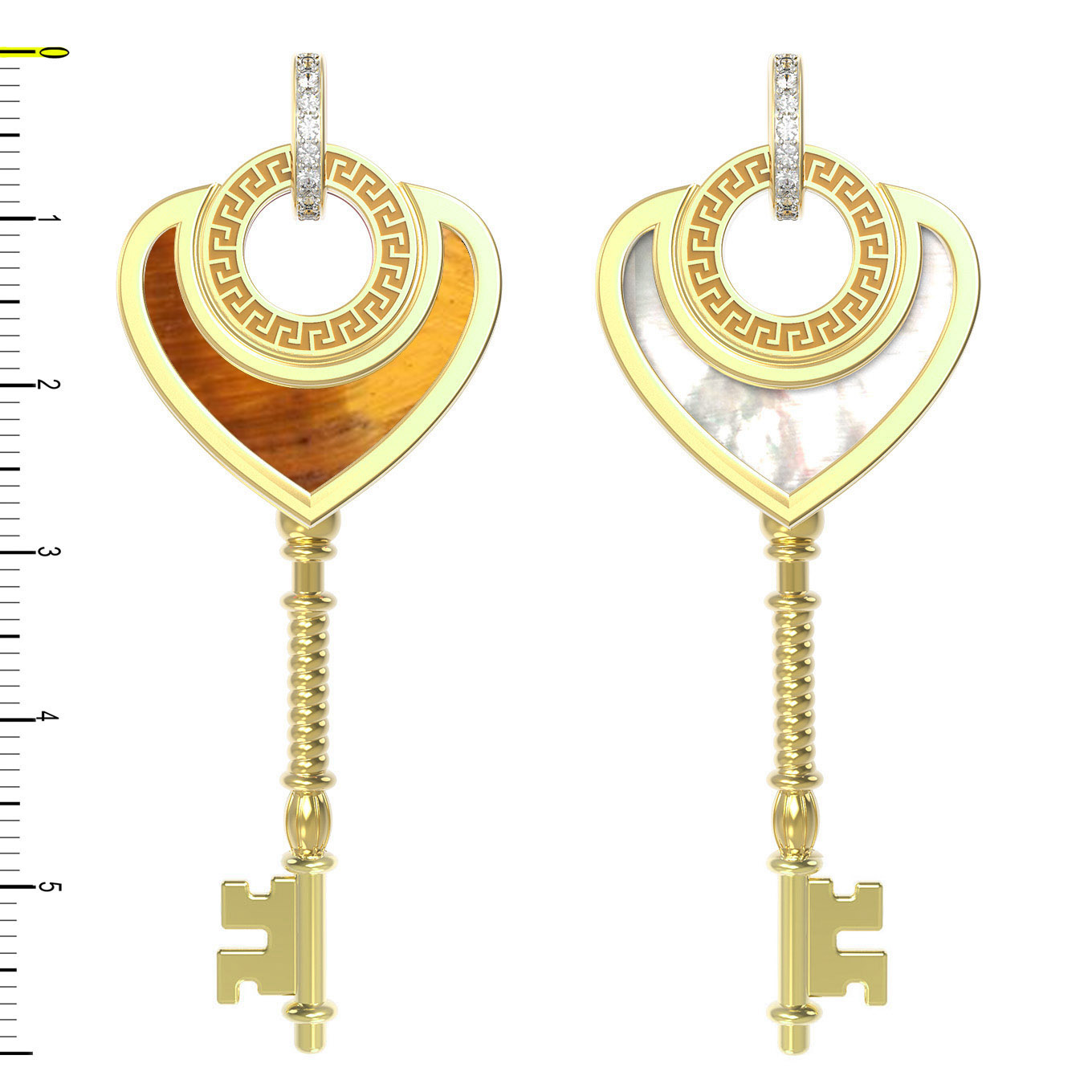 Эта оригинальная подвеска из лимонного золота 585 пробы — настоящее воплощение ювелирного мастерства. Изящное изделие из коллекции De Luxe — С любовью выполнено в форме ключа, верхняя часть которого оформлена в виде сердца. Такой символичный дизайн подчеркивает романтичность украшения и делает его запоминающимся аксессуаром. Композиция дополнена вставками из перламутра, тигрового глаза и фианита, создающими игру цвета и текстур. Всего в изделии использовано 19 вставок круглой и сердцевидной формы, переливающихся белыми, оранжевыми и нежными перламутровыми оттенками.