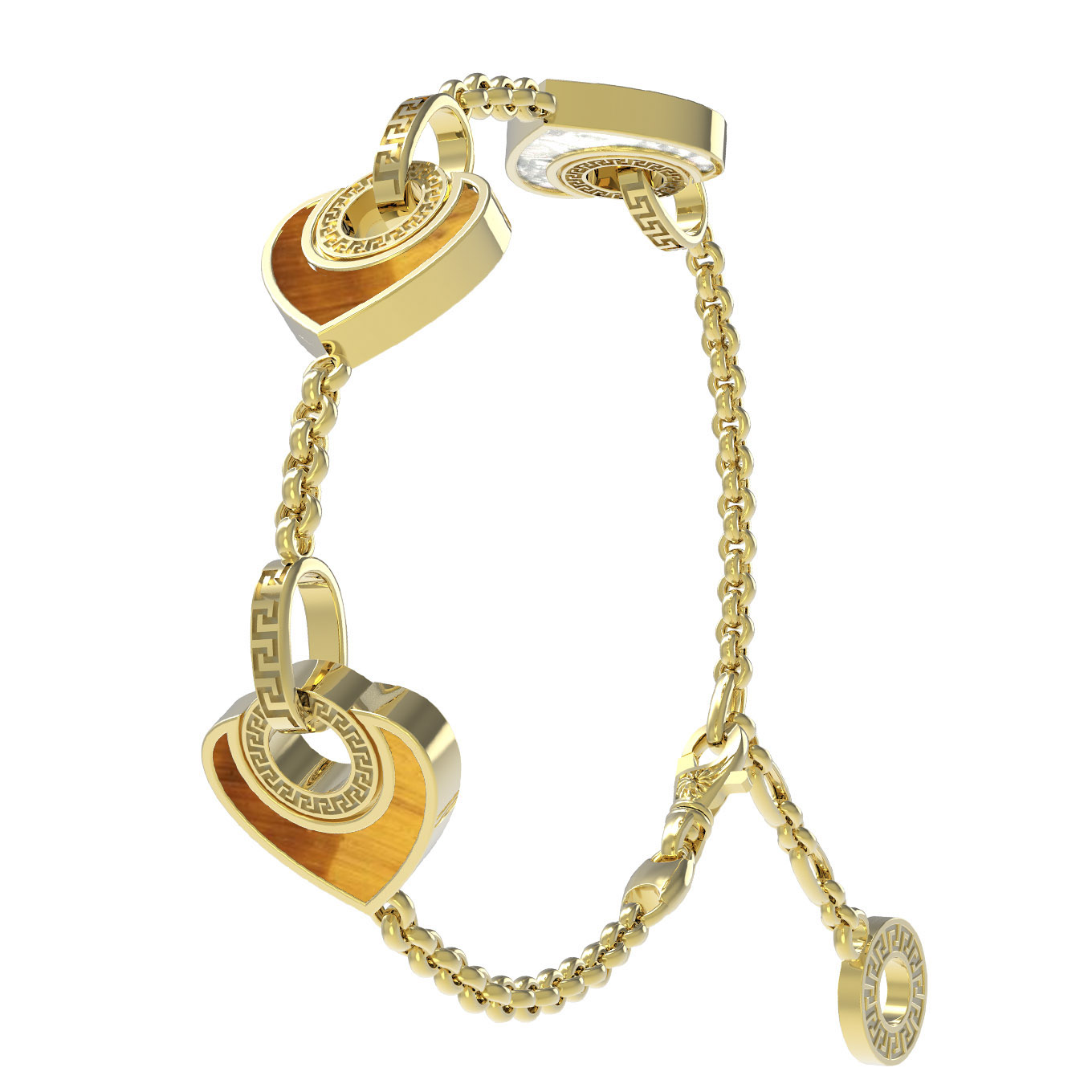 Центральными деталями композиции являются натуральные вставки — теплый оранжевый тигровый глаз и нежный перламутр. Контраст этих материалов создает уникальную игру цвета, подчеркивая премиальный статус украшения. Геометричный орнамент, дополняющий вставки в форме сердца, придает браслету завершенность и легкое ощущение античного величия. Это изделие самодостаточно, однако при желании вы можете дополнить его другими украшениями, создавая стильные комплекты. Универсальность дизайна позволяет носить браслет как в повседневной жизни, так и с вечерними нарядами, неизменно подчеркивая статус своего владельца.