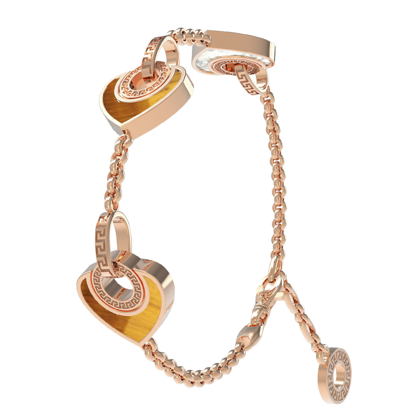 Изящный браслет из красного золота 585 пробы — это воплощение стиля и глубины, созданное для тех, кто ценит украшения со смыслом. Данное изделие входит в серию De Luxe — С любовью и привлекает внимание своим необычным дизайном, центральным элементом которого стали три вставки в форме сердца. Контрастное сочетание благородного металла с оранжевым тигровым глазом и нежным перламутром придает аксессуару особенный шарм.