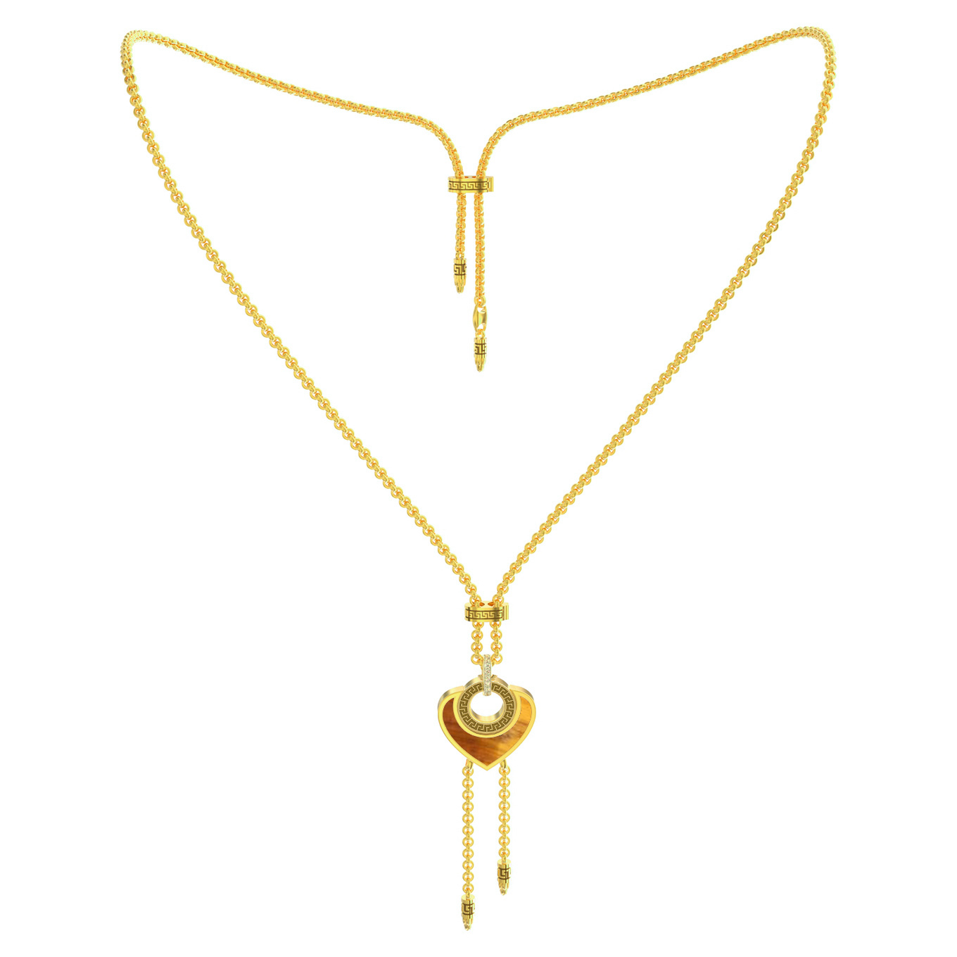 В украшении гармонично сочетаются вставки из перламутра, загадочного тигрового глаза и сверкающего фианита. Всего в изделии использовано 17 вставок, которые создают неповторимую игру света на фоне лимонного золота. Вставки имеют классические формы круга и сердца, придавая колье динамичность и современный вид. Цветовая палитра, включающая белый, оранжевый и перламутровый оттенки, позволяет легко сочетать данное колье с другими аксессуарами.