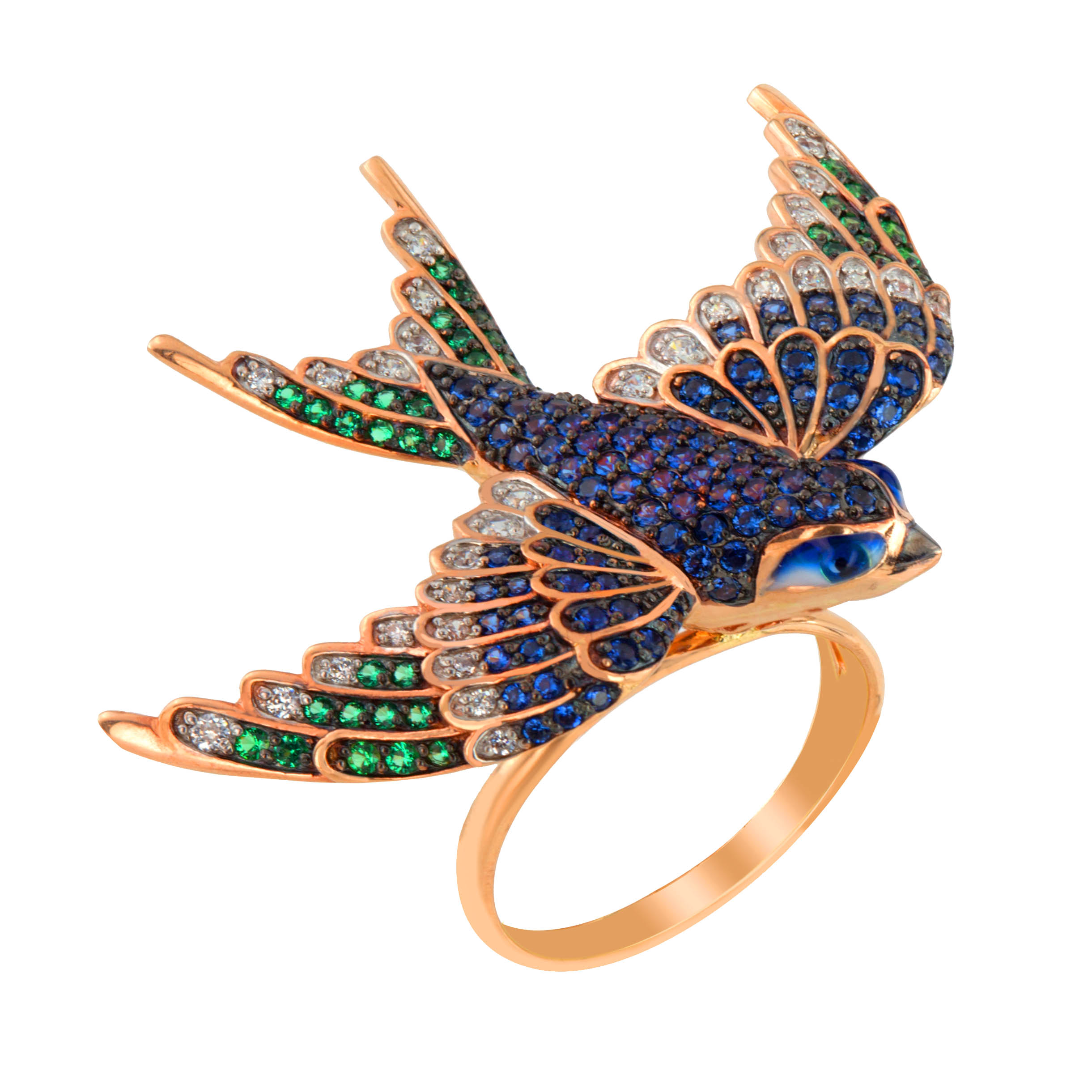 Кольцо из красного золота 585 пробы из коллекции De Luxe — Ласточки станет ярким акцентом в вашем образе и настоящим произведением ювелирного искусства. Центральный элемент украшения — детализированный дизайн в виде летящей птицы, вдохновленный грацией и свободой ласточки. Искусная работа мастеров подчеркивает каждый изгиб крыльев, превращая аксессуар в выразительный символ стиля.