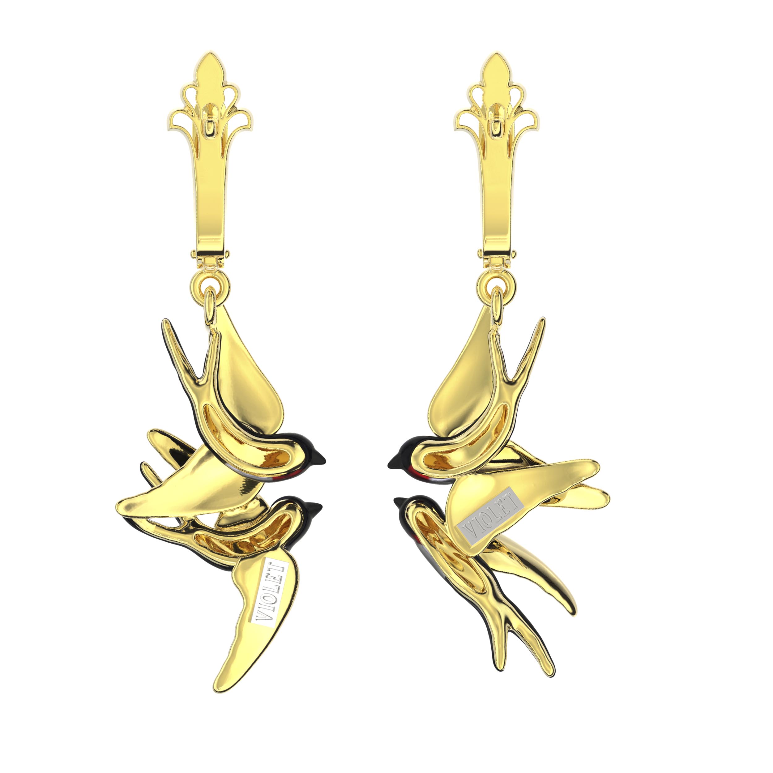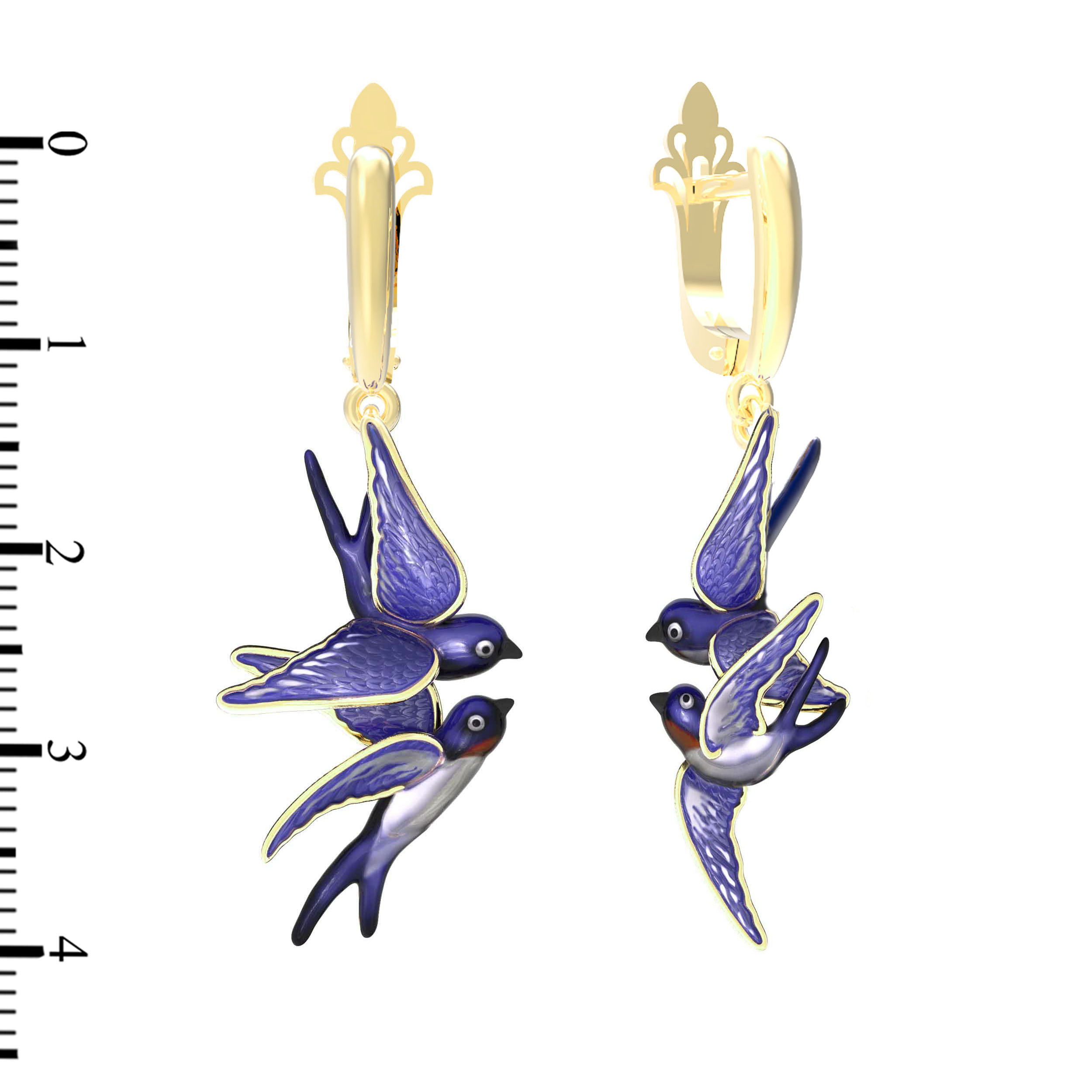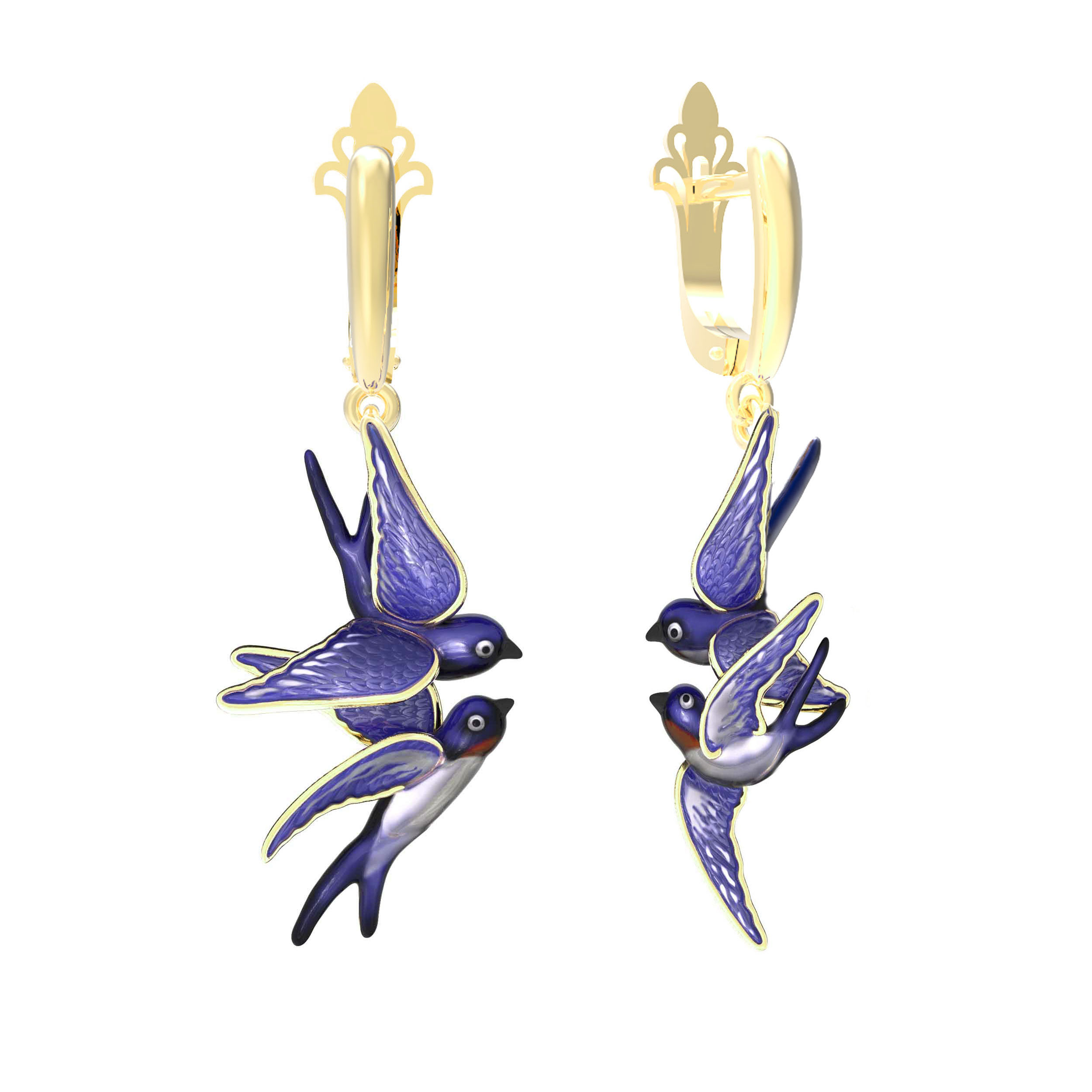 Особую художественную ценность модели придает вставка из эмали. Разноцветный декор на крыльях птиц подчеркивает тонкую проработку формы и создает приятный контраст с золотой основой. Глубокие и насыщенные оттенки эмали долго сохраняют свою яркость, радуя владельца своим первозданным видом. Данная модель универсальна: эти серьги подходят для женщин и мужчин, ценящих авторские украшения со смыслом.