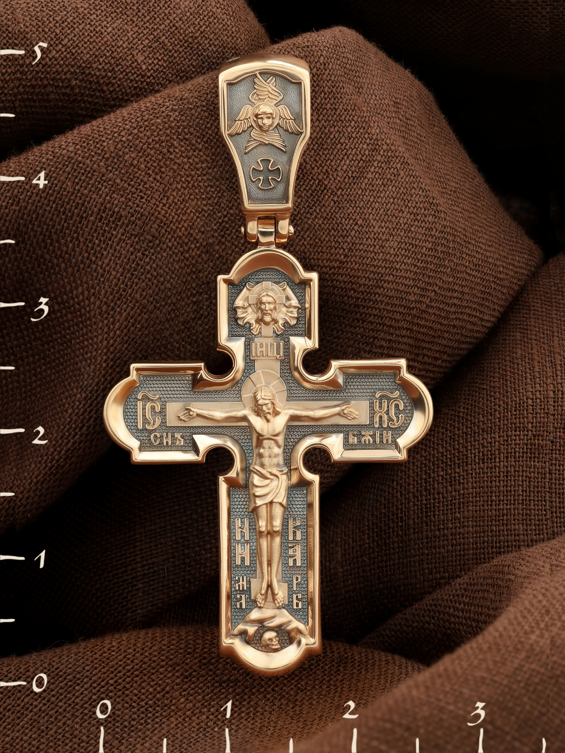 На лицевой стороне нательного креста по традиции изображено Распятие Господа нашего Иисуса Христа. Крест Господень стоит на небольшом каменистом возвышении, символизирующем гору Голгофу, которая обозначена буквами МЛРБ (Место Лобное Рай Бысть). Над головой Господа на поперечной перекладине написано «ИНЦИ», что символизирует табличку, которая была прибита к Кресту, с надписью «Иисус Назорей Царь Иудейский». Этим иудеи хотели посмеяться над Христом, не зная, что распинают истинного Царя всех царей. По сторонам основной перекладины расположены позолоченные рельефные инициалы Христа «ИС ХС». Под перекладиной, по сторонам древа, находится надпись «СЫН БОЖИЙ», а в основании креста — надпись «НИКА» (Победитель).