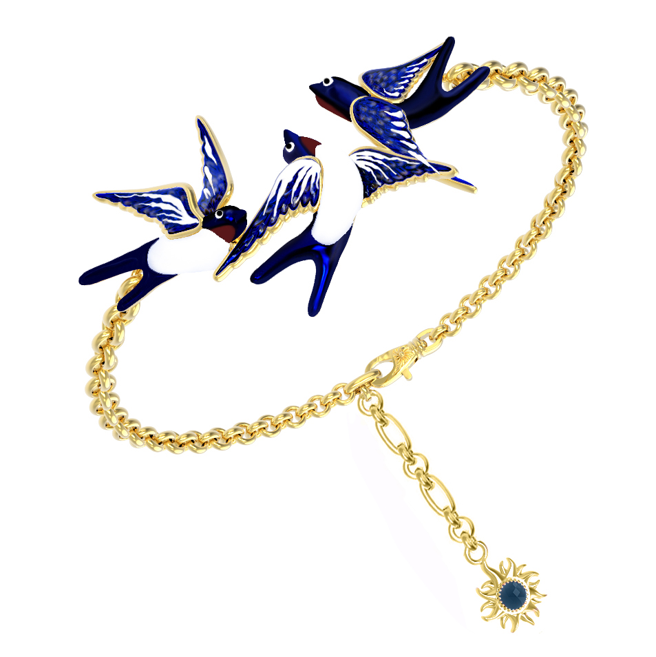 Элегантный и оригинальный браслет из лимонного золота 585 пробы станет утонченным дополнением вашего образа. Это украшение из коллекции De Luxe — Ласточки воплощает мастерство ювелиров и внимание к деталям, превращая привычный аксессуар в произведение искусства. Дизайн браслета строится вокруг изящных фигурок птиц, выполненных с использованием яркой разноцветной эмали, что придает изделию динамику и особый визуальный акцент.